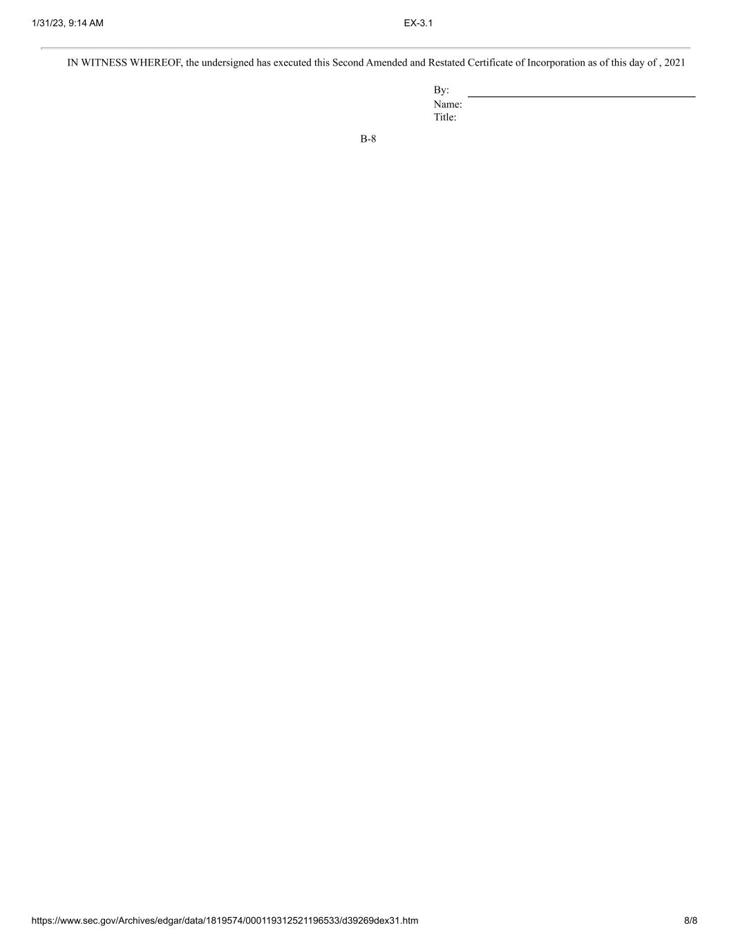 1/31/23, 9:14 AM EX-3.1 https://www.sec.gov/Archives/edgar/data/1819574/000119312521196533/d39269dex31.htm 8/8 IN WITNESS WHEREOF, the undersigned has executed this Second Amended and Restated Certificate of Incorporation as of this day of , 2021 By: Name: Title: B-8