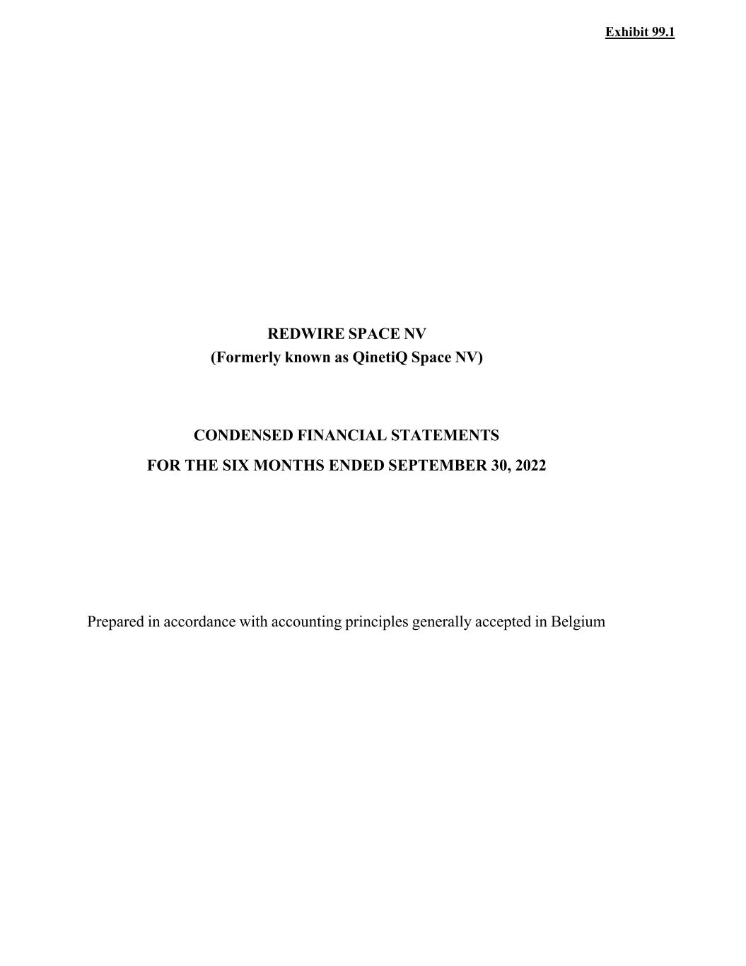 Exhibit 99.1 REDWIRE SPACE NV (Formerly known as QinetiQ Space NV) CONDENSED FINANCIAL STATEMENTS FOR THE SIX MONTHS ENDED SEPTEMBER 30, 2022 Prepared in accordance with accounting principles generally accepted in Belgium