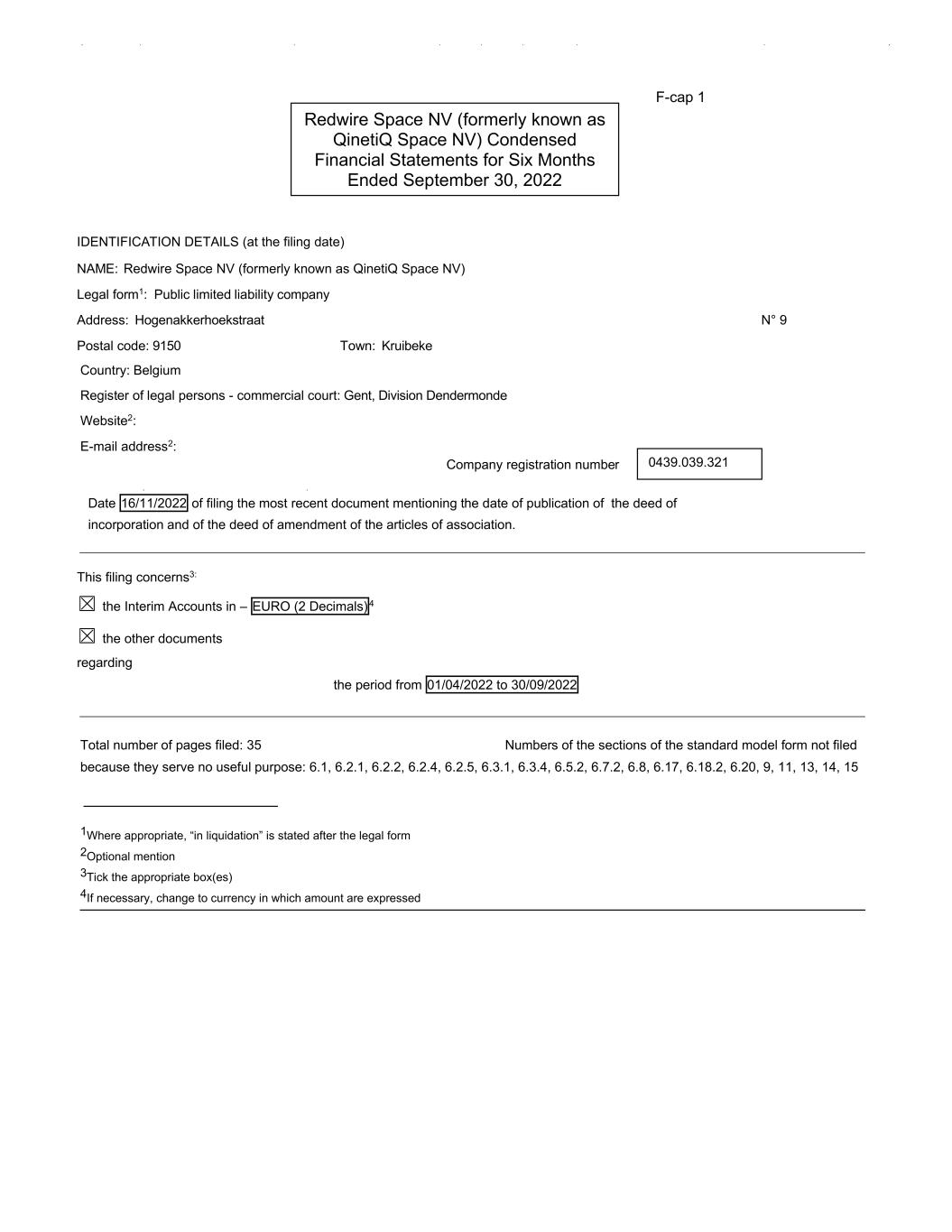 F-cap 1 IDENTIFICATION DETAILS (at the filing date) NAME: Redwire Space NV (formerly known as QinetiQ Space NV) Legal form1: Public limited liability company Address: Hogenakkerhoekstraat N° 9 Postal code: 9150 Town: Kruibeke Country: Belgium Register of legal persons - commercial court: Gent, Division Dendermonde Website2: E-mail address2: Company registration number Date 16/11/2022 of filing the most recent document mentioning the date of publication of the deed of incorporation and of the deed of amendment of the articles of association. This filing concerns3: ☒ the Interim Accounts in – EURO (2 Decimals)4 ☒ the other documents regarding the period from 01/04/2022 to 30/09/2022 Total number of pages filed: 35 Numbers of the sections of the standard model form not filed because they serve no useful purpose: 6.1, 6.2.1, 6.2.2, 6.2.4, 6.2.5, 6.3.1, 6.3.4, 6.5.2, 6.7.2, 6.8, 6.17, 6.18.2, 6.20, 9, 11, 13, 14, 15 1Where appropriate, “in liquidation” is stated after the legal form 2Optional mention 3Tick the appropriate box(es) 4If necessary, change to currency in which amount are expressed 0439.039.321 Redwire Space NV (formerly known as QinetiQ Space NV) Condensed Financial Statements for Six Months Ended September 30, 2022