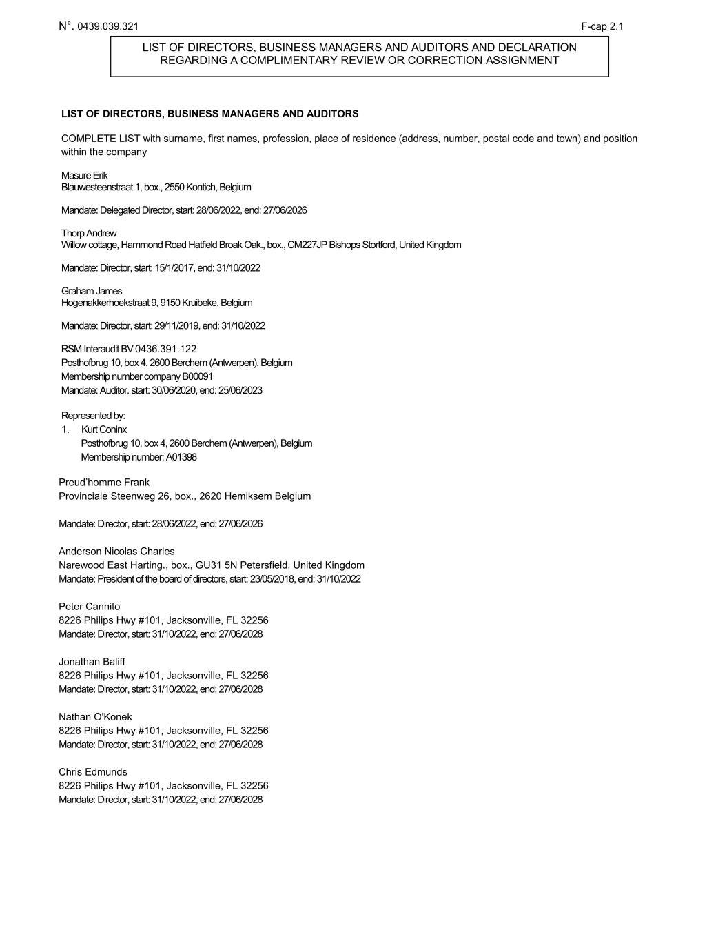 N°. 0439.039.321 F-cap 2.1 LIST OF DIRECTORS, BUSINESS MANAGERS AND AUDITORS COMPLETE LIST with surname, first names, profession, place of residence (address, number, postal code and town) and position within the company Masure Erik Blauwesteenstraat 1, box., 2550 Kontich, Belgium Mandate: Delegated Director, start: 28/06/2022, end: 27/06/2026 Thorp Andrew Willow cottage, Hammond Road Hatfield Broak Oak., box., CM227JP Bishops Stortford, United Kingdom Mandate: Director, start: 15/1/2017, end: 31/10/2022 Graham James Hogenakkerhoekstraat 9, 9150 Kruibeke, Belgium Mandate: Director, start: 29/11/2019, end: 31/10/2022 RSM Interaudit BV 0436.391.122 Posthofbrug 10, box 4, 2600 Berchem (Antwerpen), Belgium Membership number company B00091 Mandate: Auditor. start: 30/06/2020, end: 25/06/2023 Represented by: 1. Kurt Coninx Posthofbrug 10, box 4, 2600 Berchem (Antwerpen), Belgium Membership number: A01398 Preud’homme Frank Provinciale Steenweg 26, box., 2620 Hemiksem Belgium Mandate: Director, start: 28/06/2022, end: 27/06/2026 Anderson Nicolas Charles Narewood East Harting., box., GU31 5N Petersfield, United Kingdom Mandate: President of the board of directors, start: 23/05/2018, end: 31/10/2022 Peter Cannito 8226 Philips Hwy #101, Jacksonville, FL 32256 Mandate: Director, start: 31/10/2022, end: 27/06/2028 Jonathan Baliff 8226 Philips Hwy #101, Jacksonville, FL 32256 Mandate: Director, start: 31/10/2022, end: 27/06/2028 Nathan O'Konek 8226 Philips Hwy #101, Jacksonville, FL 32256 Mandate: Director, start: 31/10/2022, end: 27/06/2028 Chris Edmunds 8226 Philips Hwy #101, Jacksonville, FL 32256 Mandate: Director, start: 31/10/2022, end: 27/06/2028 LIST OF DIRECTORS, BUSINESS MANAGERS AND AUDITORS AND DECLARATION REGARDING A COMPLIMENTARY REVIEW OR CORRECTION ASSIGNMENT