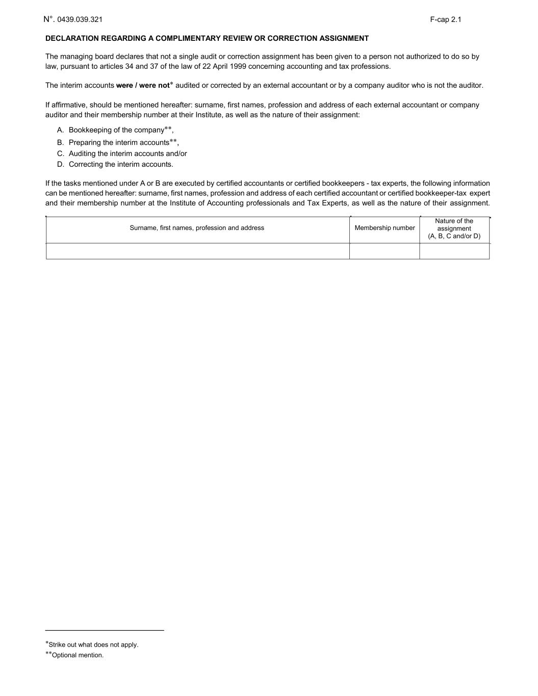 N°. 0439.039.321 F-cap 2.1 DECLARATION REGARDING A COMPLIMENTARY REVIEW OR CORRECTION ASSIGNMENT The managing board declares that not a single audit or correction assignment has been given to a person not authorized to do so by law, pursuant to articles 34 and 37 of the law of 22 April 1999 concerning accounting and tax professions. The interim accounts were / were not audited or corrected by an external accountant or by a company auditor who is not the auditor. If affirmative, should be mentioned hereafter: surname, first names, profession and address of each external accountant or company auditor and their membership number at their Institute, as well as the nature of their assignment: A. Bookkeeping of the company, B. Preparing the interim accounts, C. Auditing the interim accounts and/or D. Correcting the interim accounts. If the tasks mentioned under A or B are executed by certified accountants or certified bookkeepers - tax experts, the following information can be mentioned hereafter: surname, first names, profession and address of each certified accountant or certified bookkeeper-tax expert and their membership number at the Institute of Accounting professionals and Tax Experts, as well as the nature of their assignment. Strike out what does not apply. Optional mention. Surname, first names, profession and address Membership number Nature of the assignment (A, B, C and/or D)