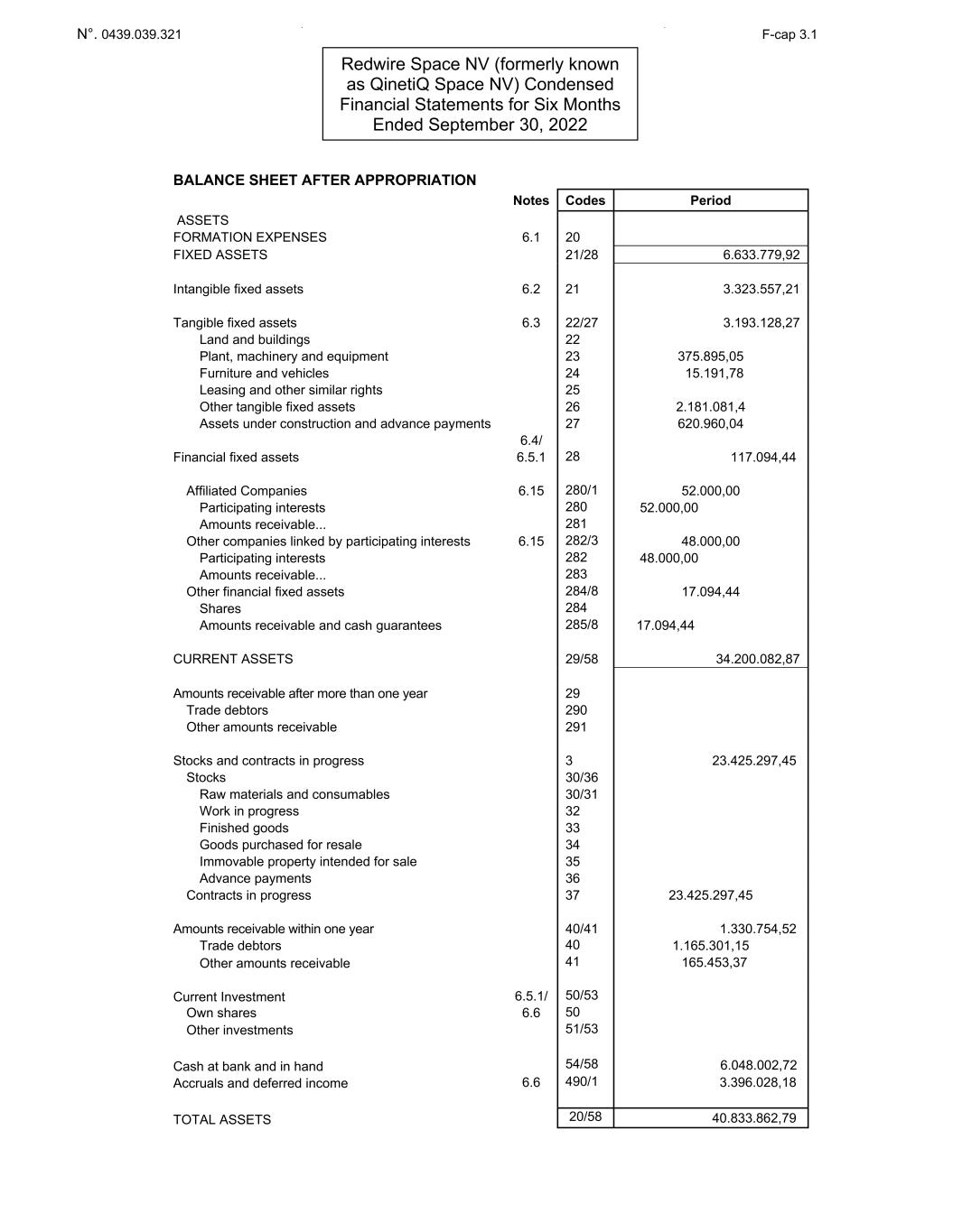 N°. 0439.039.321 F-cap 3.1 BALANCE SHEET AFTER APPROPRIATION Notes Codes Period ASSETS FORMATION EXPENSES 6.1 20 FIXED ASSETS 21/28 6.633.779,92 Intangible fixed assets 6.2 21 3.323.557,21 Tangible fixed assets 6.3 22/27 3.193.128,27 Land and buildings 22 Plant, machinery and equipment 23 375.895,05 Furniture and vehicles 24 15.191,78 Leasing and other similar rights 25 Other tangible fixed assets 26 2.181.081,4 Assets under construction and advance payments 27 620.960,04 6.4/ Financial fixed assets 6.5.1 28 117.094,44 Affiliated Companies 6.15 280/1 52.000,00 Participating interests 280 52.000,00 Amounts receivable... 281 Other companies linked by participating interests 6.15 282/3 48.000,00 Participating interests 282 48.000,00 Amounts receivable... 283 Other financial fixed assets 284/8 17.094,44 Shares 284 Amounts receivable and cash guarantees 285/8 17.094,44 CURRENT ASSETS 29/58 34.200.082,87 Amounts receivable after more than one year 29 Trade debtors 290 Other amounts receivable 291 Stocks and contracts in progress 3 23.425.297,45 Stocks 30/36 Raw materials and consumables 30/31 Work in progress 32 Finished goods 33 Goods purchased for resale 34 Immovable property intended for sale 35 Advance payments 36 Contracts in progress 37 23.425.297,45 Amounts receivable within one year 40/41 1.330.754,52 Trade debtors 40 1.165.301,15 Other amounts receivable 41 165.453,37 Current Investment 6.5.1/ 50/53 Own shares 6.6 50 Other investments 51/53 Cash at bank and in hand 54/58 6.048.002,72 Accruals and deferred income 6.6 490/1 3.396.028,18 TOTAL ASSETS 20/58 40.833.862,79 Redwire Space NV (formerly known as QinetiQ Space NV) Condensed Financial Statements for Six Months Ended September 30, 2022