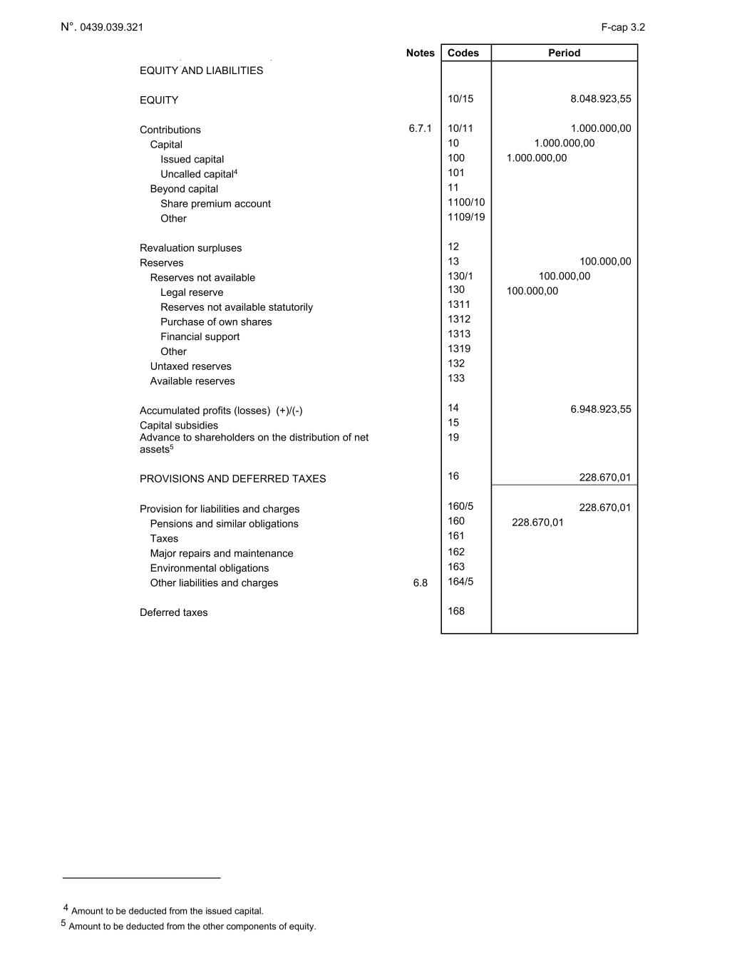 N°. 0439.039.321 F-cap 3.2   Notes Codes Period EQUITY AND LIABILITIES   EQUITY 10/15 8.048.923,55 Contributions 6.7.1 10/11 1.000.000,00 Capital 10 1.000.000,00 Issued capital 100 1.000.000,00 Uncalled capital4 101 Beyond capital 11 Share premium account 1100/10 Other 1109/19 Revaluation surpluses 12 Reserves 13 100.000,00 Reserves not available 130/1 100.000,00 Legal reserve 130 100.000,00 Reserves not available statutorily 1311 Purchase of own shares 1312 Financial support 1313 Other 1319 Untaxed reserves 132 Available reserves 133 Accumulated profits (losses) (+)/(-) 14 6.948.923,55 Capital subsidies 15 Advance to shareholders on the distribution of net assets5 19 PROVISIONS AND DEFERRED TAXES 16 228.670,01 Provision for liabilities and charges 160/5 228.670,01 Pensions and similar obligations 160 228.670,01 Taxes 161 Major repairs and maintenance 162 Environmental obligations 163 Other liabilities and charges 6.8 164/5 Deferred taxes 168 4 Amount to be deducted from the issued capital. 5 Amount to be deducted from the other components of equity.