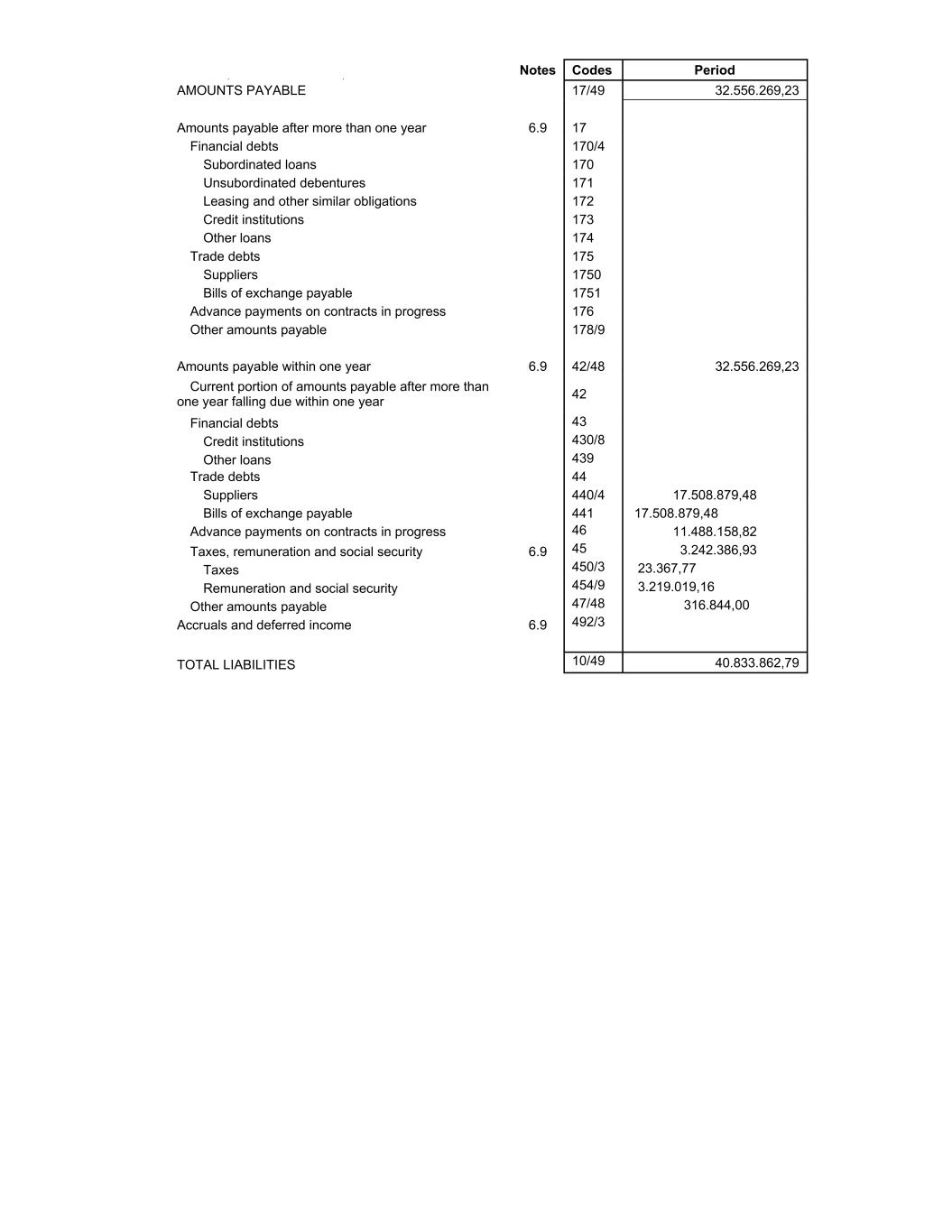 Notes Codes Period AMOUNTS PAYABLE 17/49 32.556.269,23 Amounts payable after more than one year 6.9 17 Financial debts 170/4 Subordinated loans 170 Unsubordinated debentures 171 Leasing and other similar obligations 172 Credit institutions 173 Other loans 174 Trade debts 175 Suppliers 1750 Bills of exchange payable 1751 Advance payments on contracts in progress 176 Other amounts payable 178/9 Amounts payable within one year 6.9 42/48 32.556.269,23 Current portion of amounts payable after more than one year falling due within one year 42 Financial debts 43 Credit institutions 430/8 Other loans 439 Trade debts 44 Suppliers 440/4 17.508.879,48 Bills of exchange payable 441 17.508.879,48 Advance payments on contracts in progress 46 11.488.158,82 Taxes, remuneration and social security 6.9 45 3.242.386,93 Taxes 450/3 23.367,77 Remuneration and social security 454/9 3.219.019,16 Other amounts payable 47/48 316.844,00 Accruals and deferred income 6.9 492/3 TOTAL LIABILITIES 10/49 40.833.862,79