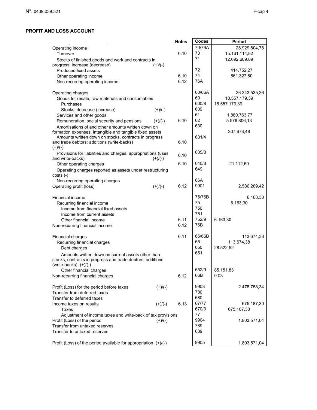 N°. 0439.039.321 F-cap 4 PROFIT AND LOSS ACCOUNT   Notes Codes Period Operating income 70/76A 28.929.804,78 Turnover 6.10 70 15.161.114,82 Stocks of finished goods and work and contracts in progress: increase (decrease) (+)/(-) 71 12.692.609.89 Produced fixed assets 72 414.752.27 Other operating income 6.10 74 661.327,80 Non-recurring operating income 6.12 76A Operating charges 60/66A 26.343.535,36 Goods for resale, raw materials and consumables 60 18.557.179,39 Purchases 600/8 18.557.179,39 Stocks: decrease (increase) (+)/(-) 609 Services and other goods 61 1.880.763,77 Remuneration, social security and pensions (+)/(-) 6.10 62 5.576.806,13 Amortisations of and other amounts written down on formation expenses, intangible and tangible fixed assets 630 307.673,48 Amounts written down on stocks, contracts in progress and trade debtors: additions (write-backs) (+)/(-) 6.10 631/4 Provisions for liabilities and charges: appropriations (uses and write-backs) (+)/(-) 6.10 635/8 Other operating charges 6.10 640/8 21.112,59 Operating charges reported as assets under restructuring costs (-) 649 Non-recurring operating charges 66A Operating profit (loss) (+)/(-) 6.12 9901 2.586.269,42 Financial income 75/76B 6.163,30 Recurring financial income 75 6.163,30 Income from financial fixed assets 750 Income from current assets 751 Other financial income 6.11 752/9 6.163,30 Non-recurring financial income 6.12 76B Financial charges 6.11 65/66B 113.674,38 Recurring financial charges 65 113.674,38 Debt charges 650 28.522,52 Amounts written down on current assets other than stocks, contracts in progress and trade debtors: additions (write-backs) (+)/(-) 651 Other financial charges 652/9 85.151,83 Non-recurring financial charges 6.12 66B 0.03 Profit (Loss) for the period before taxes (+)/(-) 9903 2.478.758,34 Transfer from deferred taxes 780 Transfer to deferred taxes 680 Income taxes on results (+)/(-) 6.13 67/77 675.187,30 Taxes 670/3 675.187,30 Adjustment of income taxes and write-back of tax provisions 77 Profit (Loss) of the period (+)/(-) 9904 1.803.571,04 Transfer from untaxed reserves 789 Transfer to untaxed reserves 689 Profit (Loss) of the period available for appropriation (+)/(-) 9905 1.803.571,04