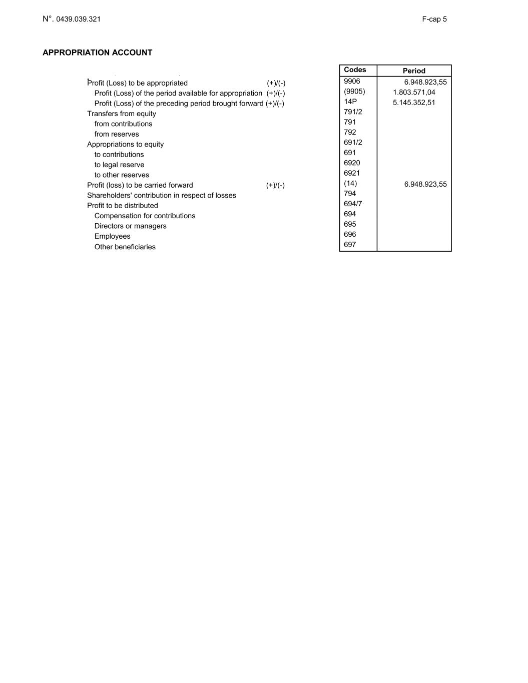 N°. 0439.039.321 F-cap 5 APPROPRIATION ACCOUNT   Codes Period Profit (Loss) to be appropriated (+)/(-)  9906 6.948.923,55 Profit (Loss) of the period available for appropriation (+)/(-) (9905) 1.803.571,04 Profit (Loss) of the preceding period brought forward (+)/(-) 14P 5.145.352,51 Transfers from equity 791/2 from contributions 791 from reserves 792 Appropriations to equity 691/2 to contributions 691 to legal reserve 6920 to other reserves 6921 Profit (loss) to be carried forward (+)/(-) (14) 6.948.923,55 Shareholders' contribution in respect of losses 794 Profit to be distributed 694/7 Compensation for contributions 694 Directors or managers 695 Employees 696 Other beneficiaries 697