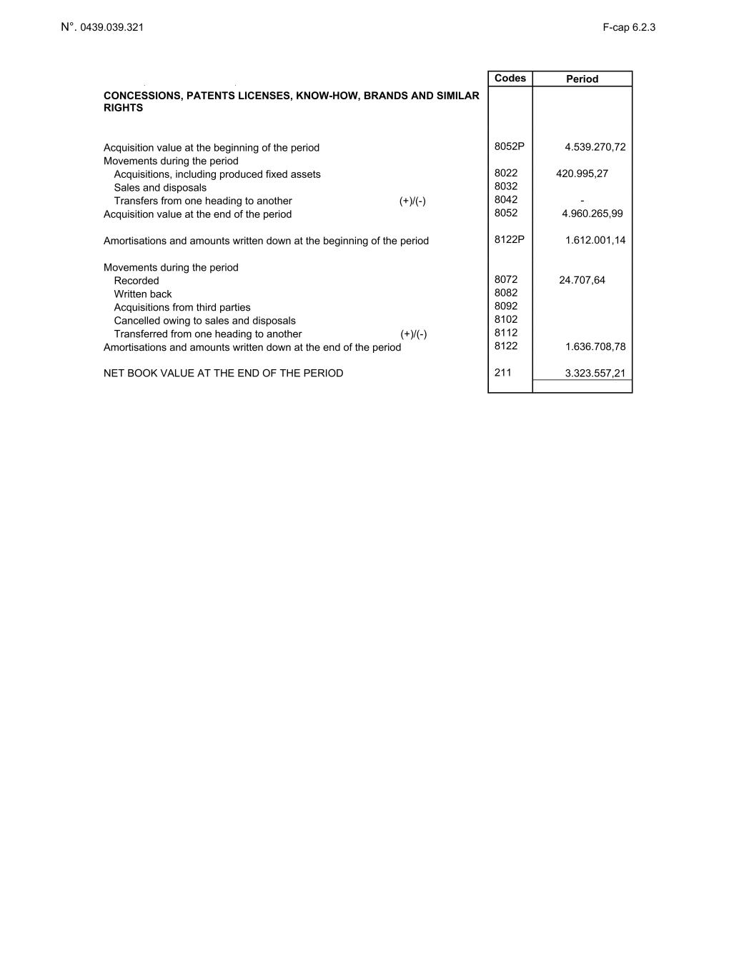 N°. 0439.039.321 F-cap 6.2.3   Codes Period CONCESSIONS, PATENTS LICENSES, KNOW-HOW, BRANDS AND SIMILAR RIGHTS Acquisition value at the beginning of the period 8052P 4.539.270,72 Movements during the period Acquisitions, including produced fixed assets 8022 420.995,27 Sales and disposals 8032 Transfers from one heading to another (+)/(-) 8042 - Acquisition value at the end of the period 8052 4.960.265,99 Amortisations and amounts written down at the beginning of the period 8122P 1.612.001,14 Movements during the period Recorded 8072 24.707,64 Written back 8082 Acquisitions from third parties 8092 Cancelled owing to sales and disposals 8102 Transferred from one heading to another (+)/(-) 8112 Amortisations and amounts written down at the end of the period 8122 1.636.708,78 NET BOOK VALUE AT THE END OF THE PERIOD 211 3.323.557,21