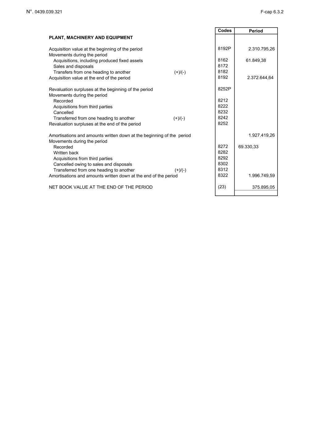 N°. 0439.039.321 F-cap 6.3.2   Codes Period PLANT, MACHINERY AND EQUIPMENT Acquisition value at the beginning of the period 8192P 2.310.795,26 Movements during the period Acquisitions, including produced fixed assets 8162 61.849,38 Sales and disposals 8172 Transfers from one heading to another (+)/(-) 8182 Acquisition value at the end of the period 8192 2.372.644,64 Revaluation surpluses at the beginning of the period 8252P Movements during the period Recorded 8212 Acquisitions from third parties 8222 Cancelled 8232 Transferred from one heading to another (+)/(-) 8242 Revaluation surpluses at the end of the period 8252 Amortisations and amounts written down at the beginning of the period 1.927.419,26 Movements during the period Recorded 8272 69.330,33 Written back 8282 Acquisitions from third parties 8292 Cancelled owing to sales and disposals 8302 Transferred from one heading to another (+)/(-) 8312 Amortisations and amounts written down at the end of the period 8322 1.996.749,59 NET BOOK VALUE AT THE END OF THE PERIOD (23) 375.895,05