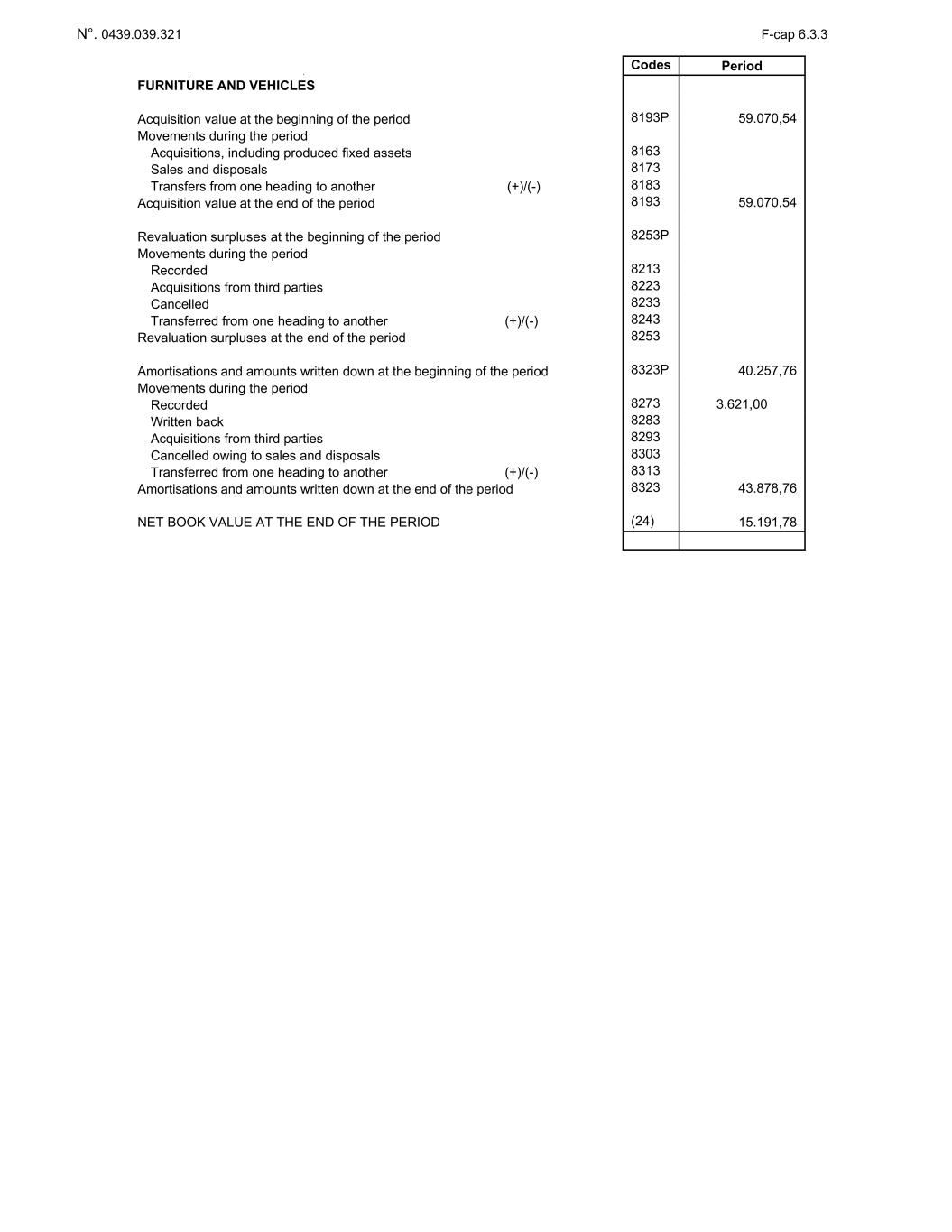 N°. 0439.039.321 F-cap 6.3.3   Codes Period FURNITURE AND VEHICLES Acquisition value at the beginning of the period 8193P 59.070,54 Movements during the period Acquisitions, including produced fixed assets 8163 Sales and disposals 8173 Transfers from one heading to another (+)/(-) 8183 Acquisition value at the end of the period 8193 59.070,54 Revaluation surpluses at the beginning of the period 8253P Movements during the period Recorded 8213 Acquisitions from third parties 8223 Cancelled 8233 Transferred from one heading to another (+)/(-) 8243 Revaluation surpluses at the end of the period 8253 Amortisations and amounts written down at the beginning of the period 8323P 40.257,76 Movements during the period Recorded 8273 3.621,00 Written back 8283 Acquisitions from third parties 8293 Cancelled owing to sales and disposals 8303 Transferred from one heading to another (+)/(-) 8313 Amortisations and amounts written down at the end of the period 8323 43.878,76 NET BOOK VALUE AT THE END OF THE PERIOD (24) 15.191,78