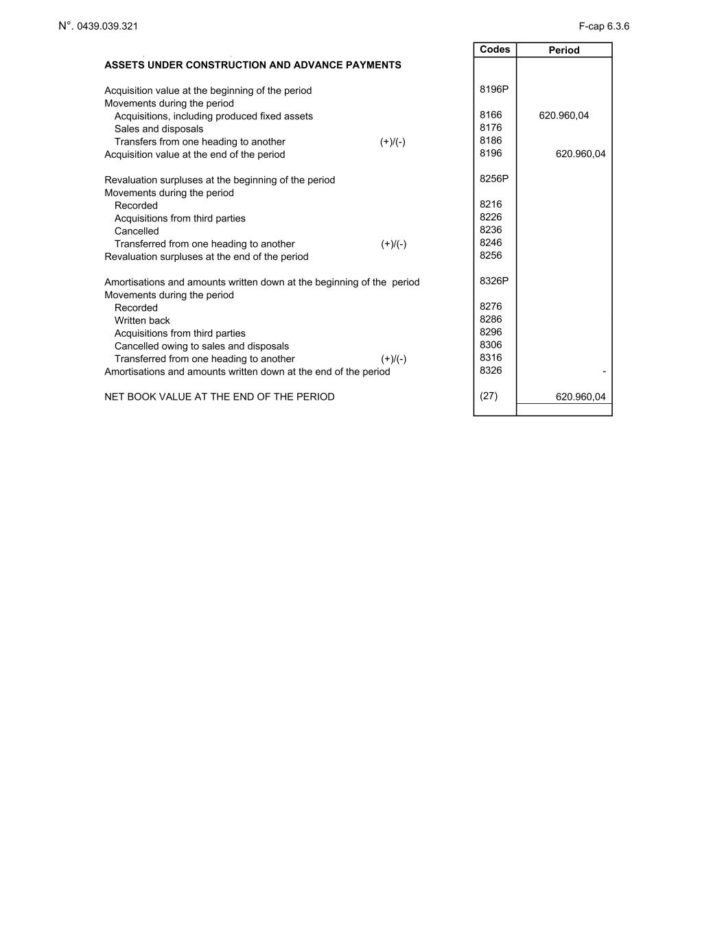 N°. 0439.039.321 F-cap 6.3.6   Codes Period ASSETS UNDER CONSTRUCTION AND ADVANCE PAYMENTS Acquisition value at the beginning of the period 8196P Movements during the period Acquisitions, including produced fixed assets 8166 620.960,04 Sales and disposals 8176 Transfers from one heading to another (+)/(-) 8186 Acquisition value at the end of the period 8196 620.960,04 Revaluation surpluses at the beginning of the period 8256P Movements during the period Recorded 8216 Acquisitions from third parties 8226 Cancelled 8236 Transferred from one heading to another (+)/(-) 8246 Revaluation surpluses at the end of the period 8256 Amortisations and amounts written down at the beginning of the period 8326P Movements during the period Recorded 8276 Written back 8286 Acquisitions from third parties 8296 Cancelled owing to sales and disposals 8306 Transferred from one heading to another (+)/(-) 8316 Amortisations and amounts written down at the end of the period 8326 - NET BOOK VALUE AT THE END OF THE PERIOD (27) 620.960,04