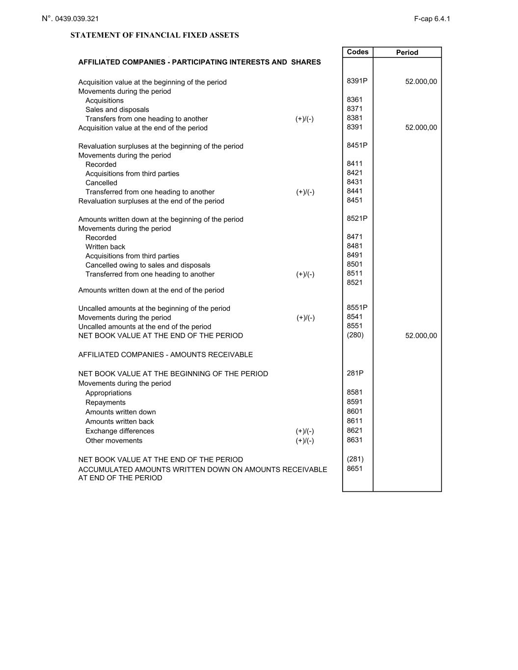 N°. 0439.039.321 F-cap 6.4.1 STATEMENT OF FINANCIAL FIXED ASSETS   Codes Period AFFILIATED COMPANIES - PARTICIPATING INTERESTS AND SHARES   Acquisition value at the beginning of the period 8391P 52.000,00 Movements during the period Acquisitions 8361 Sales and disposals 8371 Transfers from one heading to another (+)/(-) 8381 Acquisition value at the end of the period 8391 52.000,00 Revaluation surpluses at the beginning of the period 8451P Movements during the period Recorded 8411 Acquisitions from third parties 8421 Cancelled 8431 Transferred from one heading to another (+)/(-) 8441 Revaluation surpluses at the end of the period 8451 Amounts written down at the beginning of the period 8521P Movements during the period Recorded 8471 Written back 8481 Acquisitions from third parties 8491 Cancelled owing to sales and disposals 8501 Transferred from one heading to another (+)/(-) 8511 Amounts written down at the end of the period 8521 Uncalled amounts at the beginning of the period 8551P Movements during the period (+)/(-) 8541 Uncalled amounts at the end of the period 8551 NET BOOK VALUE AT THE END OF THE PERIOD (280) 52.000,00 AFFILIATED COMPANIES - AMOUNTS RECEIVABLE NET BOOK VALUE AT THE BEGINNING OF THE PERIOD 281P Movements during the period Appropriations 8581 Repayments 8591 Amounts written down 8601 Amounts written back 8611 Exchange differences (+)/(-) 8621 Other movements (+)/(-) 8631 NET BOOK VALUE AT THE END OF THE PERIOD (281) ACCUMULATED AMOUNTS WRITTEN DOWN ON AMOUNTS RECEIVABLE AT END OF THE PERIOD 8651