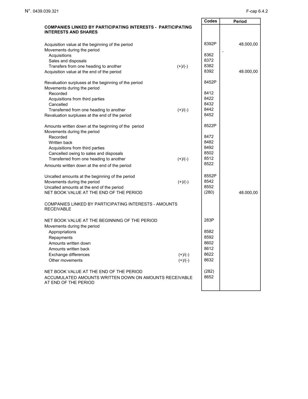 N°. 0439.039.321 F-cap 6.4.2   Codes Period COMPANIES LINKED BY PARTICIPATING INTERESTS - PARTICIPATING INTERESTS AND SHARES   Acquisition value at the beginning of the period 8392P 48.000,00 Movements during the period Acquisitions 8362 Sales and disposals 8372 Transfers from one heading to another (+)/(-) 8382 Acquisition value at the end of the period 8392 48.000,00 Revaluation surpluses at the beginning of the period 8452P Movements during the period Recorded 8412 Acquisitions from third parties 8422 Cancelled 8432 Transferred from one heading to another (+)/(-) 8442 Revaluation surpluses at the end of the period 8452 Amounts written down at the beginning of the period 8522P Movements during the period Recorded 8472 Written back 8482 Acquisitions from third parties 8492 Cancelled owing to sales and disposals 8502 Transferred from one heading to another (+)/(-) 8512 Amounts written down at the end of the period 8522 Uncalled amounts at the beginning of the period 8552P Movements during the period (+)/(-) 8542 Uncalled amounts at the end of the period 8552 NET BOOK VALUE AT THE END OF THE PERIOD (280) 48.000,00 COMPANIES LINKED BY PARTICIPATING INTERESTS - AMOUNTS RECEIVABLE NET BOOK VALUE AT THE BEGINNING OF THE PERIOD 283P Movements during the period Appropriations 8582 Repayments 8592 Amounts written down 8602 Amounts written back 8612 Exchange differences (+)/(-) 8622 Other movements (+)/(-) 8632 NET BOOK VALUE AT THE END OF THE PERIOD (282) ACCUMULATED AMOUNTS WRITTEN DOWN ON AMOUNTS RECEIVABLE AT END OF THE PERIOD 8652