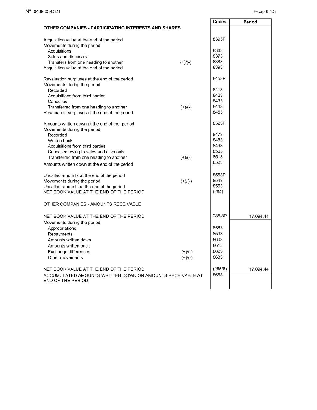 N°. 0439.039.321 F-cap 6.4.3   Codes Period OTHER COMPANIES - PARTICIPATING INTERESTS AND SHARES Acquisition value at the end of the period 8393P Movements during the period Acquisitions 8363 Sales and disposals 8373 Transfers from one heading to another (+)/(-) 8383 Acquisition value at the end of the period 8393 Revaluation surpluses at the end of the period 8453P Movements during the period Recorded 8413 Acquisitions from third parties 8423 Cancelled 8433 Transferred from one heading to another (+)/(-) 8443 Revaluation surpluses at the end of the period 8453 Amounts written down at the end of the period 8523P Movements during the period Recorded 8473 Written back 8483 Acquisitions from third parties 8493 Cancelled owing to sales and disposals 8503 Transferred from one heading to another (+)/(-) 8513 Amounts written down at the end of the period 8523 Uncalled amounts at the end of the period 8553P Movements during the period (+)/(-) 8543 Uncalled amounts at the end of the period 8553 NET BOOK VALUE AT THE END OF THE PERIOD (284) OTHER COMPANIES - AMOUNTS RECEIVABLE NET BOOK VALUE AT THE END OF THE PERIOD 285/8P 17.094,44 Movements during the period Appropriations 8583 Repayments 8593 Amounts written down 8603 Amounts written back 8613 Exchange differences (+)/(-) 8623 Other movements (+)/(-) 8633 NET BOOK VALUE AT THE END OF THE PERIOD (285/8) 17.094,44 ACCUMULATED AMOUNTS WRITTEN DOWN ON AMOUNTS RECEIVABLE AT END OF THE PERIOD 8653