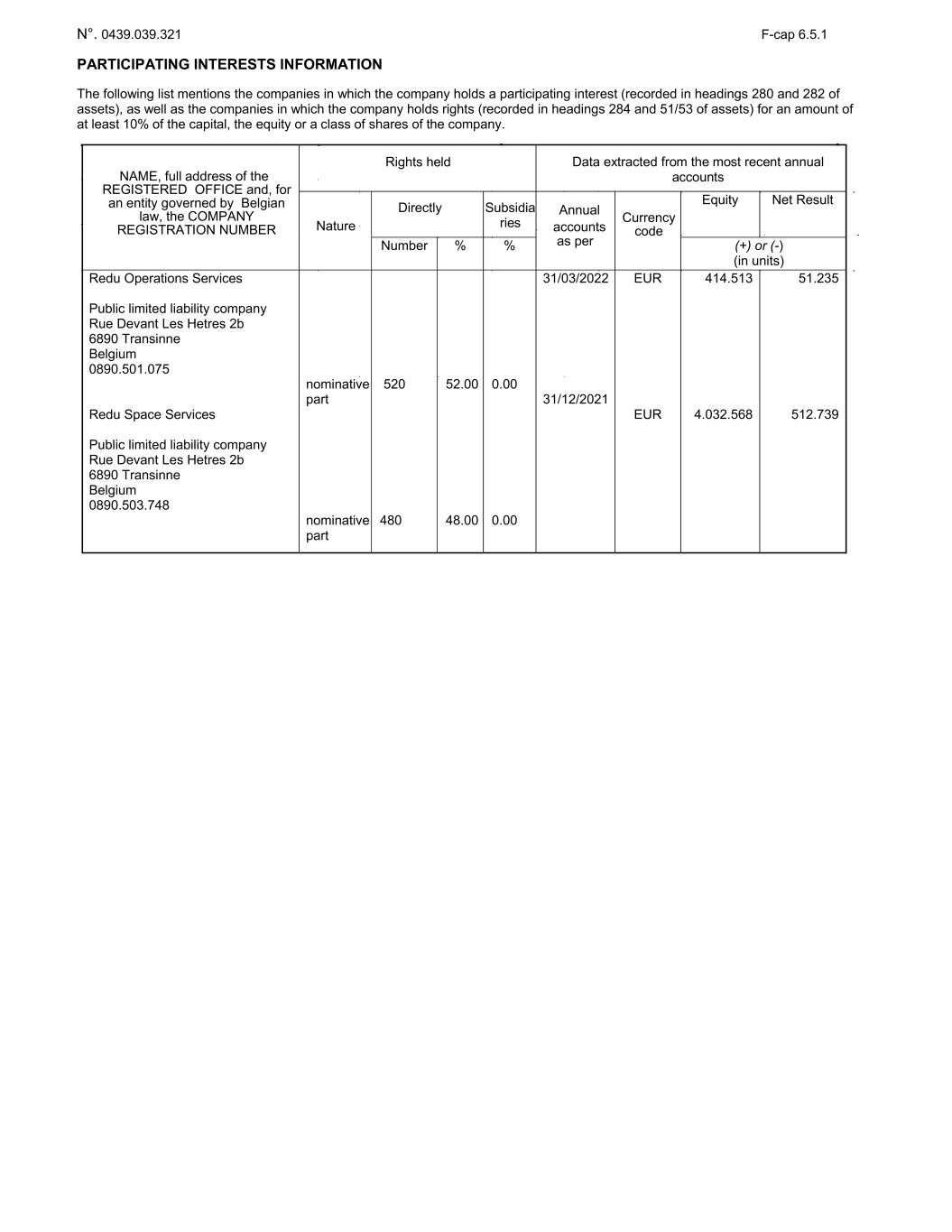 N°. 0439.039.321 F-cap 6.5.1 PARTICIPATING INTERESTS INFORMATION The following list mentions the companies in which the company holds a participating interest (recorded in headings 280 and 282 of assets), as well as the companies in which the company holds rights (recorded in headings 284 and 51/53 of assets) for an amount of at least 10% of the capital, the equity or a class of shares of the company. NAME, full address of the REGISTERED OFFICE and, for an entity governed by Belgian law, the COMPANY REGISTRATION NUMBER Rights held Data extracted from the most recent annual accounts Nature Directly Subsidia ries Annual accounts as per Currency code Equity Net Result Number % % (+) or (-) (in units) Redu Operations Services Public limited liability company Rue Devant Les Hetres 2b 6890 Transinne Belgium 0890.501.075 Redu Space Services Public limited liability company Rue Devant Les Hetres 2b 6890 Transinne Belgium 0890.503.748 nominative part nominative part 520 480 52.00 48.00 0.00 0.00 31/03/2022 31/12/2021 EUR EUR 414.513 4.032.568 51.235 512.739