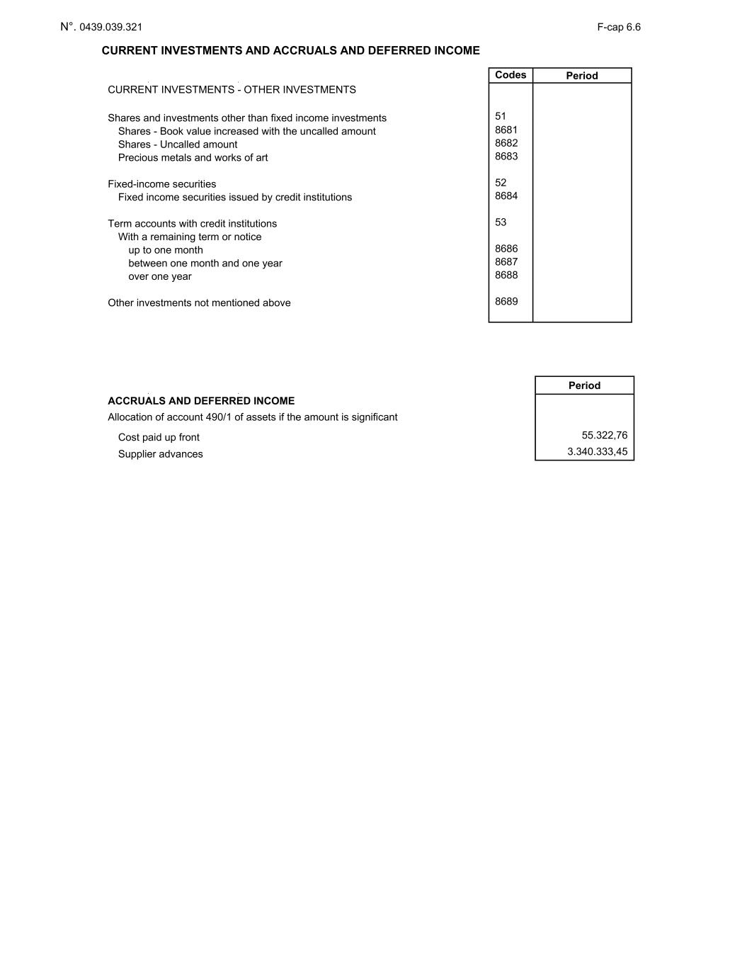 N°. 0439.039.321 F-cap 6.6 CURRENT INVESTMENTS AND ACCRUALS AND DEFERRED INCOME   Codes Period CURRENT INVESTMENTS - OTHER INVESTMENTS Shares and investments other than fixed income investments 51 Shares - Book value increased with the uncalled amount 8681 Shares - Uncalled amount 8682 Precious metals and works of art 8683 Fixed-income securities 52 Fixed income securities issued by credit institutions 8684 Term accounts with credit institutions 53 With a remaining term or notice up to one month 8686 between one month and one year 8687 over one year 8688 Other investments not mentioned above 8689   Period ACCRUALS AND DEFERRED INCOME Allocation of account 490/1 of assets if the amount is significant Cost paid up front 55.322,76 Supplier advances 3.340.333,45