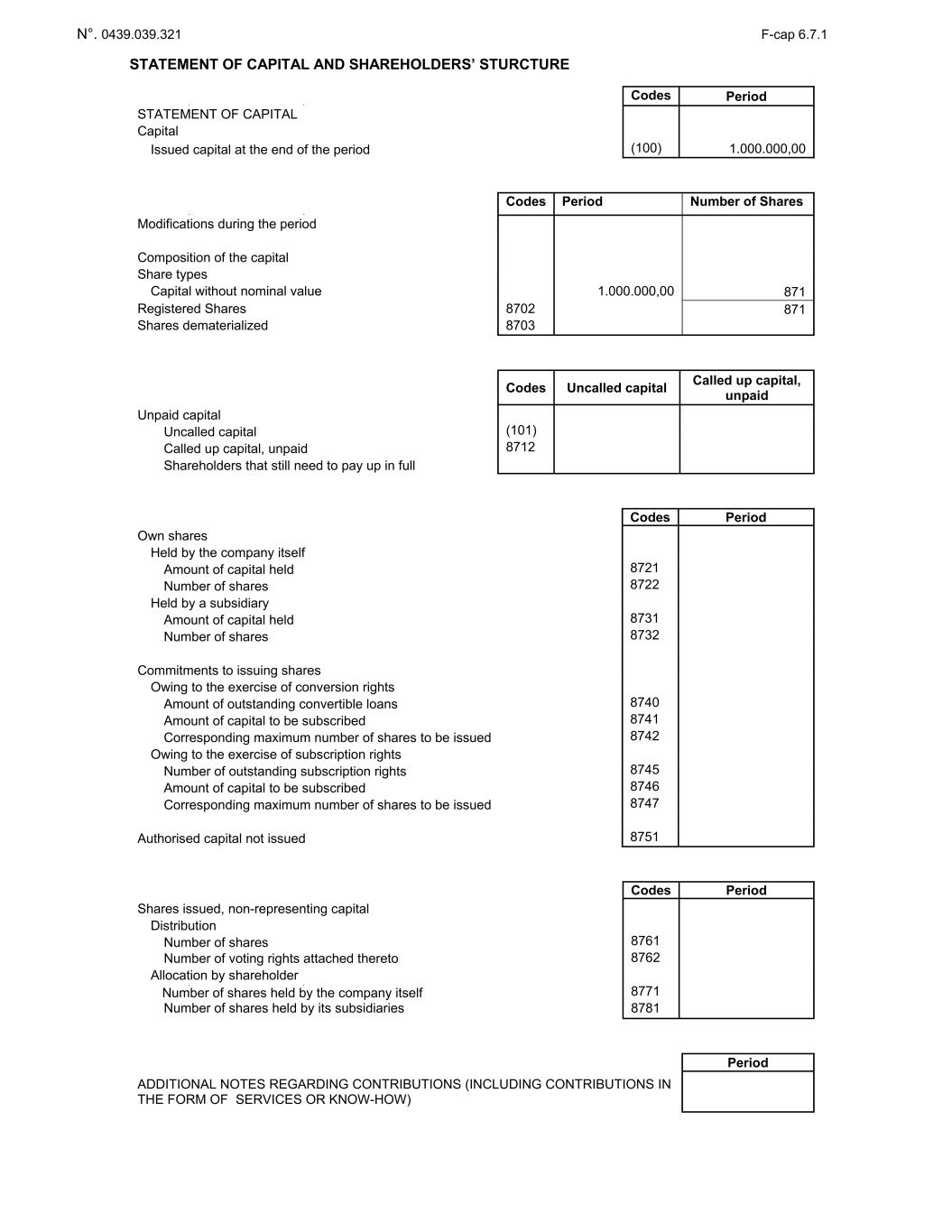 N°. 0439.039.321 F-cap 6.7.1 STATEMENT OF CAPITAL AND SHAREHOLDERS’ STURCTURE   Codes Period STATEMENT OF CAPITAL Capital Issued capital at the end of the period (100) 1.000.000,00   Codes Period Number of Shares Modifications during the period Composition of the capital Share types Capital without nominal value 1.000.000,00 871 Registered Shares 8702 871 Shares dematerialized 8703 Codes Uncalled capital Called up capital, unpaid Unpaid capital Uncalled capital (101) Called up capital, unpaid 8712 Shareholders that still need to pay up in full Codes Period Own shares Held by the company itself Amount of capital held 8721 Number of shares 8722 Held by a subsidiary Amount of capital held 8731 Number of shares 8732 Commitments to issuing shares Owing to the exercise of conversion rights Amount of outstanding convertible loans 8740 Amount of capital to be subscribed 8741 Corresponding maximum number of shares to be issued 8742 Owing to the exercise of subscription rights Number of outstanding subscription rights 8745 Amount of capital to be subscribed 8746 Corresponding maximum number of shares to be issued 8747 Authorised capital not issued 8751 Codes Period Shares issued, non-representing capital Distribution Number of shares 8761 Number of voting rights attached thereto 8762 Allocation by shareholder Number of shares held by the company itself   8771 Number of shares held by its subsidiaries 8781 Period ADDITIONAL NOTES REGARDING CONTRIBUTIONS (INCLUDING CONTRIBUTIONS IN THE FORM OF SERVICES OR KNOW-HOW)