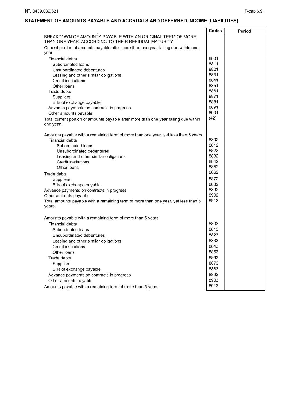 N°. 0439.039.321 F-cap 6.9 STATEMENT OF AMOUNTS PAYABLE AND ACCRUALS AND DEFERRED INCOME (LIABILITIES)   Codes Period BREAKDOWN OF AMOUNTS PAYABLE WITH AN ORIGINAL TERM OF MORE THAN ONE YEAR, ACCORDING TO THEIR RESIDUAL MATURITY Current portion of amounts payable after more than one year falling due within one year Financial debts 8801 Subordinated loans 8811 Unsubordinated debentures 8821 Leasing and other similar obligations 8831 Credit institutions 8841 Other loans 8851 Trade debts 8861 Suppliers 8871 Bills of exchange payable 8881 Advance payments on contracts in progress 8891 Other amounts payable 8901 Total current portion of amounts payable after more than one year falling due within one year (42) Amounts payable with a remaining term of more than one year, yet less than 5 years Financial debts 8802 Subordinated loans 8812 Unsubordinated debentures 8822 Leasing and other similar obligations 8832 Credit institutions 8842 Other loans 8852 Trade debts 8862 Suppliers 8872 Bills of exchange payable 8882 Advance payments on contracts in progress 8892 Other amounts payable 8902 Total amounts payable with a remaining term of more than one year, yet less than 5 years 8912 Amounts payable with a remaining term of more than 5 years Financial debts 8803 Subordinated loans 8813 Unsubordinated debentures 8823 Leasing and other similar obligations 8833 Credit institutions 8843 Other loans 8853 Trade debts 8863 Suppliers 8873 Bills of exchange payable 8883 Advance payments on contracts in progress 8893 Other amounts payable 8903 Amounts payable with a remaining term of more than 5 years 8913