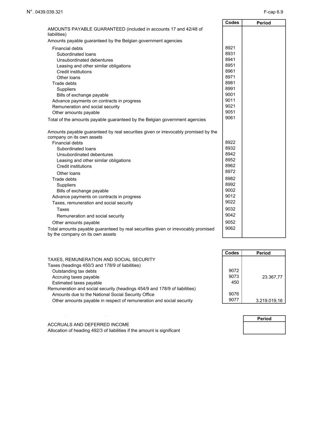 N°. 0439.039.321 F-cap 6.9   Codes Period AMOUNTS PAYABLE GUARANTEED (included in accounts 17 and 42/48 of liabilities) Amounts payable guaranteed by the Belgian government agencies Financial debts 8921 Subordinated loans 8931 Unsubordinated debentures 8941 Leasing and other similar obligations 8951 Credit institutions 8961 Other loans 8971 Trade debts 8981 Suppliers 8991 Bills of exchange payable 9001 Advance payments on contracts in progress 9011 Remuneration and social security 9021 Other amounts payable 9051 Total of the amounts payable guaranteed by the Belgian government agencies 9061 Amounts payable guaranteed by real securities given or irrevocably promised by the company on its own assets Financial debts 8922 Subordinated loans 8932 Unsubordinated debentures 8942 Leasing and other similar obligations 8952 Credit institutions 8962 Other loans 8972 Trade debts 8982 Suppliers 8992 Bills of exchange payable 9002 Advance payments on contracts in progress 9012 Taxes, remuneration and social security 9022 Taxes 9032 Remuneration and social security 9042 Other amounts payable 9052 Total amounts payable guaranteed by real securities given or irrevocably promised by the company on its own assets 9062 Codes Period TAXES, REMUNERATION AND SOCIAL SECURITY Taxes (headings 450/3 and 178/9 of liabilities) Outstanding tax debts 9072 Accruing taxes payable 9073 23.367,77 Estimated taxes payable 450 Remuneration and social security (headings 454/9 and 178/9 of liabilities) Amounts due to the National Social Security Office 9076 Other amounts payable in respect of remuneration and social security 9077 3.219.019,16   Period ACCRUALS AND DEFERRED INCOME Allocation of heading 492/3 of liabilities if the amount is significant