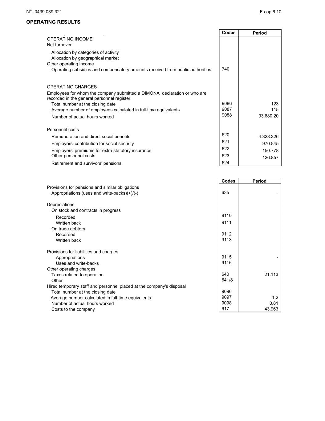N°. 0439.039.321 F-cap 6.10 OPERATING RESULTS   Codes Period OPERATING INCOME Net turnover Allocation by categories of activity Allocation by geographical market Other operating income Operating subsidies and compensatory amounts received from public authorities 740 OPERATING CHARGES Employees for whom the company submitted a DIMONA declaration or who are recorded in the general personnel register Total number at the closing date 9086 123 Average number of employees calculated in full-time equivalents 9087 115 Number of actual hours worked 9088 93.680,20 Personnel costs Remuneration and direct social benefits 620 4.328.326 Employers' contribution for social security 621 970.845 Employers' premiums for extra statutory insurance 622 150.778 Other personnel costs 623 126.857 Retirement and survivors' pensions 624 Codes Period Provisions for pensions and similar obligations Appropriations (uses and write-backs)(+)/(-) 635 - Depreciations On stock and contracts in progress Recorded 9110 Written back 9111 On trade debtors Recorded 9112 Written back 9113 Provisions for liabilities and charges Appropriations 9115 - Uses and write-backs 9116 Other operating charges Taxes related to operation 640 21.113 Other 641/8 Hired temporary staff and personnel placed at the company's disposal Total number at the closing date 9096 Average number calculated in full-time equivalents 9097 1,2 Number of actual hours worked 9098 0,81 Costs to the company 617 43.963
