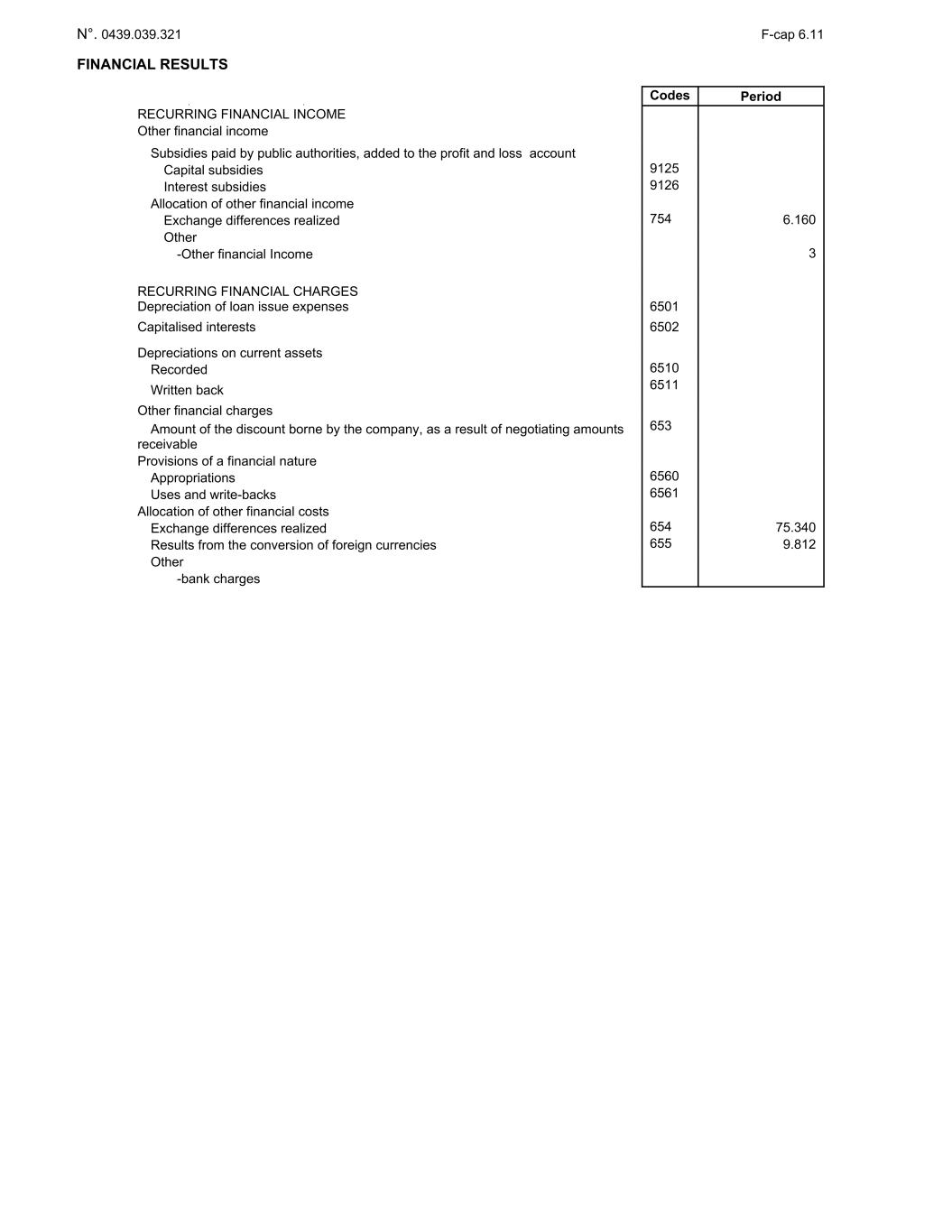 N°. 0439.039.321 F-cap 6.11 FINANCIAL RESULTS   Codes Period RECURRING FINANCIAL INCOME Other financial income Subsidies paid by public authorities, added to the profit and loss account Capital subsidies 9125 Interest subsidies 9126 Allocation of other financial income Exchange differences realized 754 6.160 Other -Other financial Income 3 RECURRING FINANCIAL CHARGES Depreciation of loan issue expenses 6501 Capitalised interests 6502 Depreciations on current assets Recorded 6510 Written back 6511 Other financial charges Amount of the discount borne by the company, as a result of negotiating amounts receivable 653 Provisions of a financial nature Appropriations 6560 Uses and write-backs 6561 Allocation of other financial costs Exchange differences realized 654 75.340 Results from the conversion of foreign currencies 655 9.812 Other -bank charges