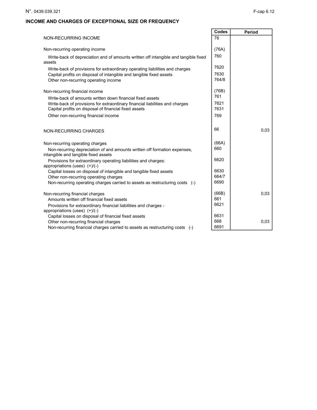 N°. 0439.039.321 F-cap 6.12 INCOME AND CHARGES OF EXCEPTIONAL SIZE OR FREQUENCY   Codes Period NON-RECURRING INCOME 76 Non-recurring operating income (76A) Write-back of depreciation and of amounts written off intangible and tangible fixed assets 760 Write-back of provisions for extraordinary operating liabilities and charges 7620 Capital profits on disposal of intangible and tangible fixed assets 7630 Other non-recurring operating income 764/8 Non-recurring financial income (76B) Write-back of amounts written down financial fixed assets 761 Write-back of provisions for extraordinary financial liabilities and charges 7621 Capital profits on disposal of financial fixed assets 7631 Other non-recurring financial income 769 NON-RECURRING CHARGES 66 0,03 Non-recurring operating charges (66A) Non-recurring depreciation of and amounts written off formation expenses, intangible and tangible fixed assets 660 Provisions for extraordinary operating liabilities and charges: appropriations (uses) (+)/(-) 6620 Capital losses on disposal of intangible and tangible fixed assets 6630 Other non-recurring operating charges 664/7 Non-recurring operating charges carried to assets as restructuring costs (-) 6690 Non-recurring financial charges (66B) 0,03 Amounts written off financial fixed assets 661 Provisions for extraordinary financial liabilities and charges - appropriations (uses) (+)/(-) 6621 Capital losses on disposal of financial fixed assets 6631 Other non-recurring financial charges 668 0,03 Non-recurring financial charges carried to assets as restructuring costs (-) 6691