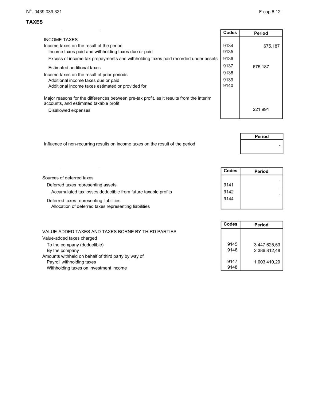 N°. 0439.039.321 F-cap 6.12 TAXES    Codes Period Sources of deferred taxes Deferred taxes representing assets 9141 Accumulated tax losses deductible from future taxable profits 9142 Deferred taxes representing liabilities 9144 Allocation of deferred taxes representing liabilities Codes Period VALUE-ADDED TAXES AND TAXES BORNE BY THIRD PARTIES Value-added taxes charged To the company (deductible) 9145 3.447.625,53 By the company 9146 2.386.812,48 Amounts withheld on behalf of third party by way of Payroll withholding taxes 9147 1.003.410,29 Withholding taxes on investment income 9148    Codes Period INCOME TAXES Income taxes on the result of the period 9134 675.187 Income taxes paid and withholding taxes due or paid 9135 Excess of income tax prepayments and withholding taxes paid recorded under assets 9136 Estimated additional taxes 9137 675.187 Income taxes on the result of prior periods 9138 Additional income taxes due or paid 9139 Additional income taxes estimated or provided for 9140 Major reasons for the differences between pre-tax profit, as it results from the interim accounts, and estimated taxable profit Disallowed expenses 221.991 Period Influence of non-recurring results on income taxes on the result of the period