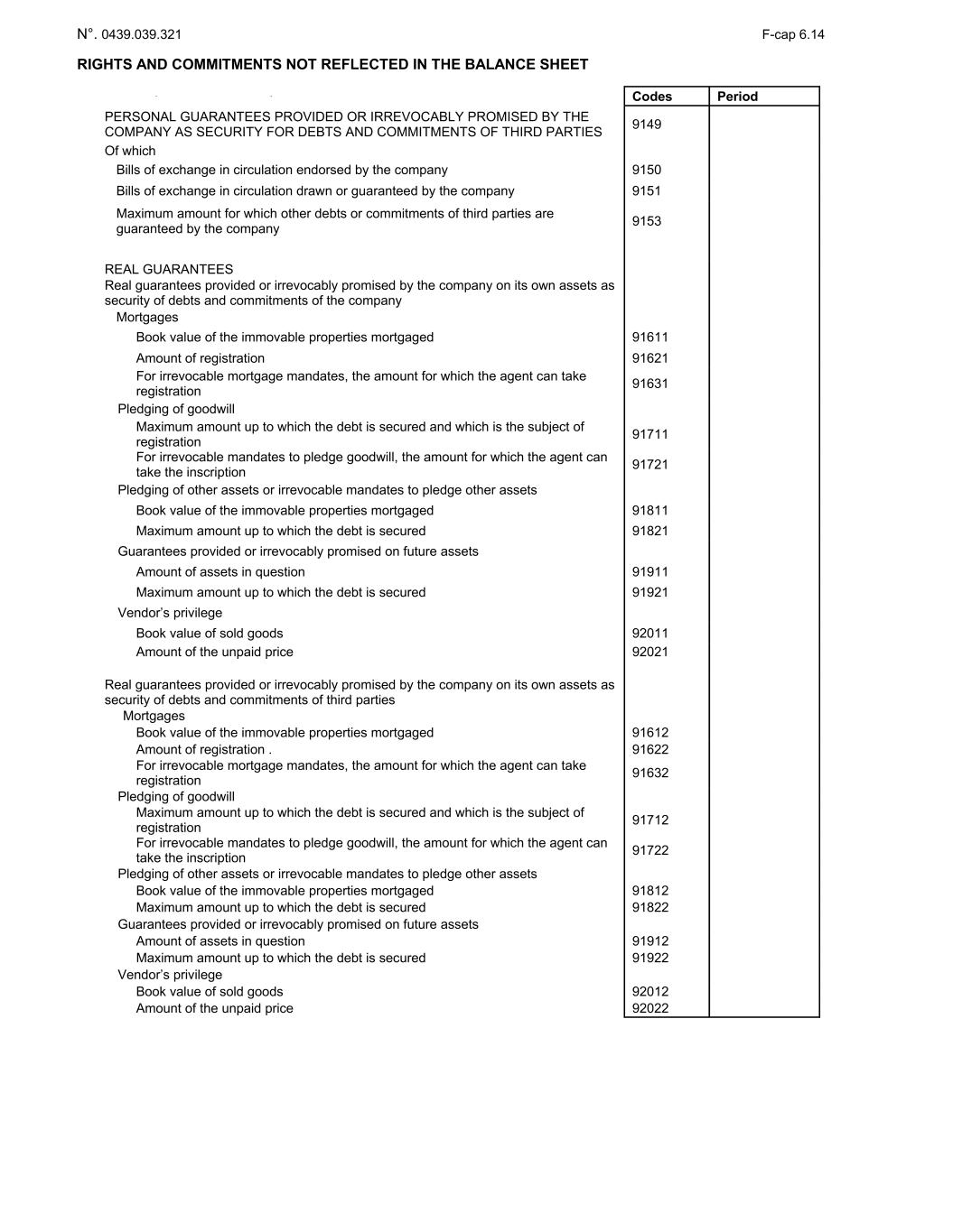 N°. 0439.039.321 F-cap 6.14 RIGHTS AND COMMITMENTS NOT REFLECTED IN THE BALANCE SHEET   Codes Period PERSONAL GUARANTEES PROVIDED OR IRREVOCABLY PROMISED BY THE COMPANY AS SECURITY FOR DEBTS AND COMMITMENTS OF THIRD PARTIES 9149 Of which Bills of exchange in circulation endorsed by the company 9150 Bills of exchange in circulation drawn or guaranteed by the company 9151 Maximum amount for which other debts or commitments of third parties are guaranteed by the company 9153 REAL GUARANTEES Real guarantees provided or irrevocably promised by the company on its own assets as security of debts and commitments of the company Mortgages Book value of the immovable properties mortgaged 91611 Amount of registration 91621 For irrevocable mortgage mandates, the amount for which the agent can take registration 91631 Pledging of goodwill Maximum amount up to which the debt is secured and which is the subject of registration 91711 For irrevocable mandates to pledge goodwill, the amount for which the agent can take the inscription 91721 Pledging of other assets or irrevocable mandates to pledge other assets Book value of the immovable properties mortgaged 91811 Maximum amount up to which the debt is secured 91821 Guarantees provided or irrevocably promised on future assets Amount of assets in question 91911 Maximum amount up to which the debt is secured 91921 Vendor’s privilege Book value of sold goods 92011 Amount of the unpaid price 92021 Real guarantees provided or irrevocably promised by the company on its own assets as security of debts and commitments of third parties Mortgages Book value of the immovable properties mortgaged 91612 Amount of registration . 91622 For irrevocable mortgage mandates, the amount for which the agent can take registration 91632 Pledging of goodwill Maximum amount up to which the debt is secured and which is the subject of registration 91712 For irrevocable mandates to pledge goodwill, the amount for which the agent can take the inscription 91722 Pledging of other assets or irrevocable mandates to pledge other assets Book value of the immovable properties mortgaged 91812 Maximum amount up to which the debt is secured 91822 Guarantees provided or irrevocably promised on future assets Amount of assets in question 91912 Maximum amount up to which the debt is secured 91922 Vendor’s privilege Book value of sold goods 92012 Amount of the unpaid price 92022