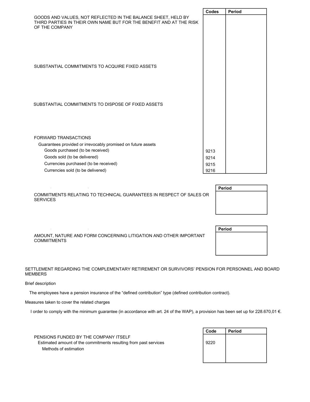 Codes Period GOODS AND VALUES, NOT REFLECTED IN THE BALANCE SHEET, HELD BY THIRD PARTIES IN THEIR OWN NAME BUT FOR THE BENEFIT AND AT THE RISK OF THE COMPANY SUBSTANTIAL COMMITMENTS TO ACQUIRE FIXED ASSETS SUBSTANTIAL COMMITMENTS TO DISPOSE OF FIXED ASSETS FORWARD TRANSACTIONS Guarantees provided or irrevocably promised on future assets Goods purchased (to be received) 9213 Goods sold (to be delivered) 9214 Currencies purchased (to be received) 9215 Currencies sold (to be delivered) 9216   Period COMMITMENTS RELATING TO TECHNICAL GUARANTEES IN RESPECT OF SALES OR SERVICES   Period AMOUNT, NATURE AND FORM CONCERNING LITIGATION AND OTHER IMPORTANT COMMITMENTS SETTLEMENT REGARDING THE COMPLEMENTARY RETIREMENT OR SURVIVORS’ PENSION FOR PERSONNEL AND BOARD MEMBERS Brief description The employees have a pension insurance of the “defined contribution” type (defined contribution contract). Measures taken to cover the related charges I order to comply with the minimum guarantee (in accordance with art. 24 of the WAP), a provision has been set up for 228.670,01 €.   Code Period PENSIONS FUNDED BY THE COMPANY ITSELF Estimated amount of the commitments resulting from past services 9220 Methods of estimation
