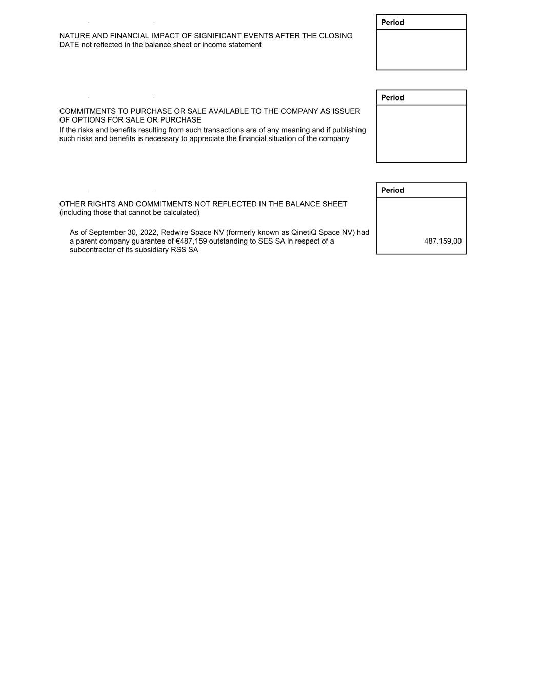 Period NATURE AND FINANCIAL IMPACT OF SIGNIFICANT EVENTS AFTER THE CLOSING DATE not reflected in the balance sheet or income statement   Period COMMITMENTS TO PURCHASE OR SALE AVAILABLE TO THE COMPANY AS ISSUER OF OPTIONS FOR SALE OR PURCHASE If the risks and benefits resulting from such transactions are of any meaning and if publishing such risks and benefits is necessary to appreciate the financial situation of the company   Period OTHER RIGHTS AND COMMITMENTS NOT REFLECTED IN THE BALANCE SHEET (including those that cannot be calculated) As of September 30, 2022, Redwire Space NV (formerly known as QinetiQ Space NV) had a parent company guarantee of €487,159 outstanding to SES SA in respect of a subcontractor of its subsidiary RSS SA 487.159,00