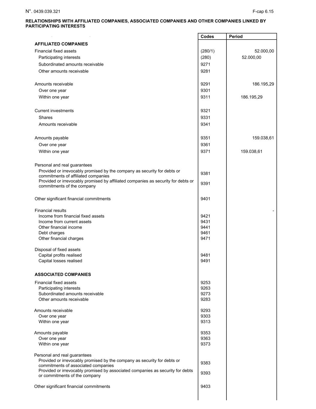 N°. 0439.039.321 F-cap 6.15 RELATIONSHIPS WITH AFFILIATED COMPANIES, ASSOCIATED COMPANIES AND OTHER COMPANIES LINKED BY PARTICIPATING INTERESTS   Codes Period AFFILIATED COMPANIES Financial fixed assets (280/1) 52.000,00 Participating interests (280) 52.000,00 Subordinated amounts receivable 9271 Other amounts receivable 9281 Amounts receivable 9291 186.195,29 Over one year 9301 Within one year 9311 186.195,29 Current investments 9321 Shares 9331 Amounts receivable 9341 Amounts payable 9351 159.038,61 Over one year 9361 Within one year 9371 159.038,61 Personal and real guarantees Provided or irrevocably promised by the company as security for debts or commitments of affiliated companies 9381 Provided or irrevocably promised by affiliated companies as security for debts or commitments of the company 9391 Other significant financial commitments 9401 Financial results - Income from financial fixed assets 9421 Income from current assets 9431 Other financial income 9441 Debt charges 9461 Other financial charges 9471 Disposal of fixed assets Capital profits realised 9481 Capital losses realised 9491 ASSOCIATED COMPANIES Financial fixed assets 9253 Participating interests 9263 Subordinated amounts receivable 9273 Other amounts receivable 9283 Amounts receivable 9293 Over one year 9303 Within one year 9313 Amounts payable 9353 Over one year 9363 Within one year 9373 Personal and real guarantees Provided or irrevocably promised by the company as security for debts or commitments of associated companies 9383 Provided or irrevocably promised by associated companies as security for debts or commitments of the company 9393 Other significant financial commitments 9403