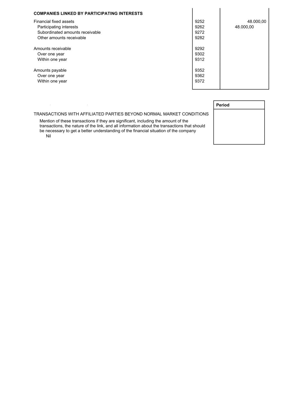 COMPANIES LINKED BY PARTICIPATING INTERESTS Financial fixed assets 9252 48.000,00 Participating interests 9262 48.000,00 Subordinated amounts receivable 9272 Other amounts receivable 9282 Amounts receivable 9292 Over one year 9302 Within one year 9312 Amounts payable 9352 Over one year 9362 Within one year 9372   Period TRANSACTIONS WITH AFFILIATED PARTIES BEYOND NORMAL MARKET CONDITIONS Mention of these transactions if they are significant, including the amount of the transactions, the nature of the link, and all information about the transactions that should be necessary to get a better understanding of the financial situation of the company Nil