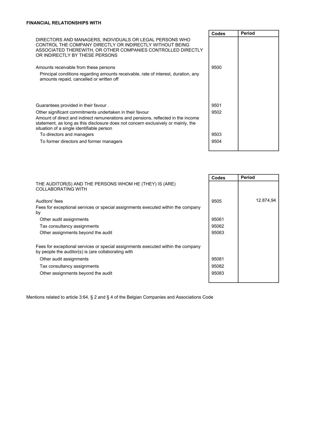 FINANCIAL RELATIONSHIPS WITH   Codes Period DIRECTORS AND MANAGERS, INDIVIDUALS OR LEGAL PERSONS WHO CONTROL THE COMPANY DIRECTLY OR INDIRECTLY WITHOUT BEING ASSOCIATED THEREWITH, OR OTHER COMPANIES CONTROLLED DIRECTLY OR INDIRECTLY BY THESE PERSONS Amounts receivable from these persons 9500 Principal conditions regarding amounts receivable, rate of interest, duration, any amounts repaid, cancelled or written off Guarantees provided in their favour . 9501 Other significant commitments undertaken in their favour 9502 Amount of direct and indirect remunerations and pensions, reflected in the income statement, as long as this disclosure does not concern exclusively or mainly, the situation of a single identifiable person To directors and managers 9503 To former directors and former managers 9504   Codes Period THE AUDITOR(S) AND THE PERSONS WHOM HE (THEY) IS (ARE) COLLABORATING WITH Auditors' fees 9505 12.874,94 Fees for exceptional services or special assignments executed within the company by Other audit assignments 95061 Tax consultancy assignments 95062 Other assignments beyond the audit 95063 Fees for exceptional services or special assignments executed within the company by people the auditor(s) is (are collaborating with Other audit assignments 95081 Tax consultancy assignments 95082 Other assignments beyond the audit 95083 Mentions related to article 3:64, § 2 and § 4 of the Belgian Companies and Associations Code