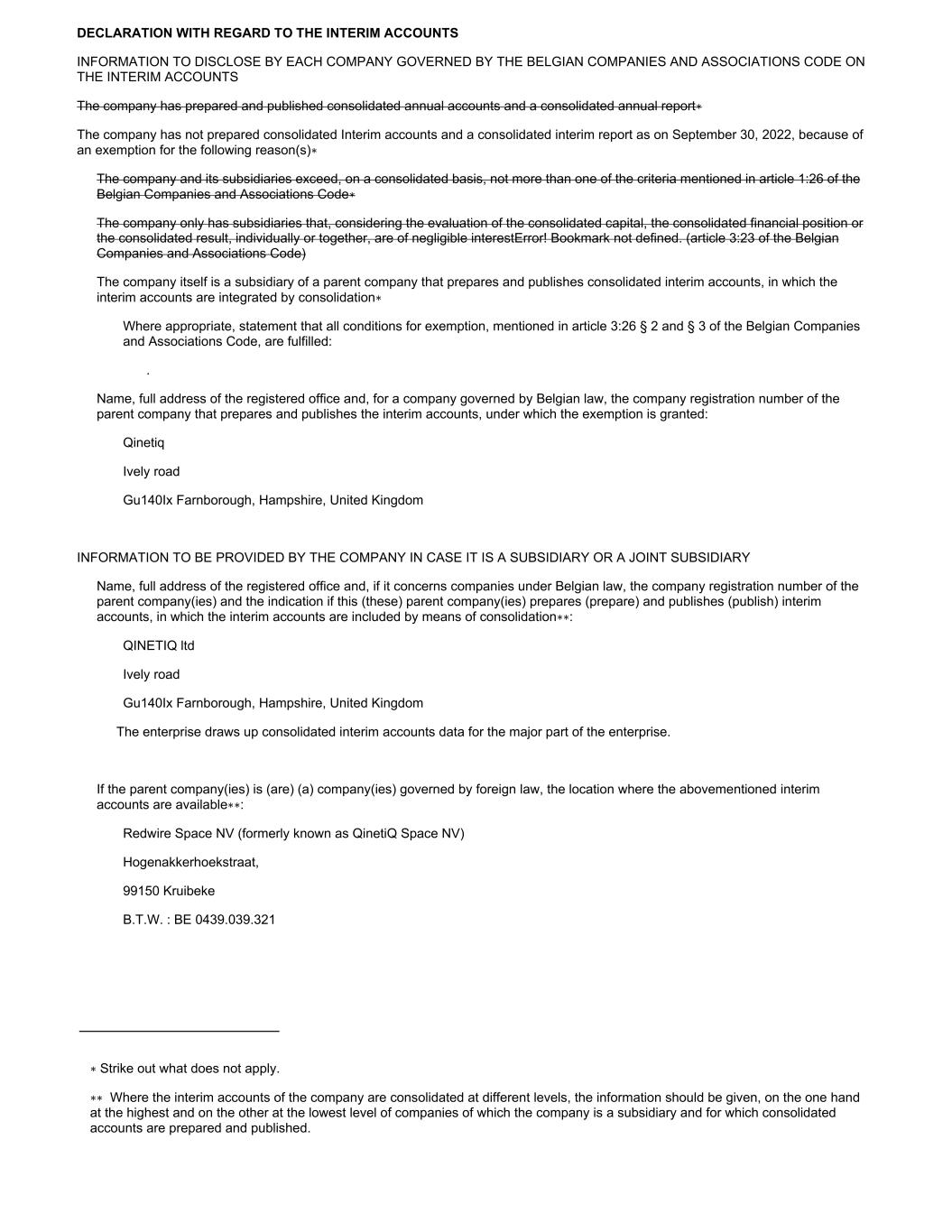 DECLARATION WITH REGARD TO THE INTERIM ACCOUNTS INFORMATION TO DISCLOSE BY EACH COMPANY GOVERNED BY THE BELGIAN COMPANIES AND ASSOCIATIONS CODE ON THE INTERIM ACCOUNTS The company has prepared and published consolidated annual accounts and a consolidated annual report∗ The company has not prepared consolidated Interim accounts and a consolidated interim report as on September 30, 2022, because of an exemption for the following reason(s)∗ The company and its subsidiaries exceed, on a consolidated basis, not more than one of the criteria mentioned in article 1:26 of the Belgian Companies and Associations Code∗ The company only has subsidiaries that, considering the evaluation of the consolidated capital, the consolidated financial position or the consolidated result, individually or together, are of negligible interestError! Bookmark not defined. (article 3:23 of the Belgian Companies and Associations Code) The company itself is a subsidiary of a parent company that prepares and publishes consolidated interim accounts, in which the interim accounts are integrated by consolidation∗ Where appropriate, statement that all conditions for exemption, mentioned in article 3:26 § 2 and § 3 of the Belgian Companies and Associations Code, are fulfilled: . Name, full address of the registered office and, for a company governed by Belgian law, the company registration number of the parent company that prepares and publishes the interim accounts, under which the exemption is granted: Qinetiq Ively road Gu140Ix Farnborough, Hampshire, United Kingdom INFORMATION TO BE PROVIDED BY THE COMPANY IN CASE IT IS A SUBSIDIARY OR A JOINT SUBSIDIARY Name, full address of the registered office and, if it concerns companies under Belgian law, the company registration number of the parent company(ies) and the indication if this (these) parent company(ies) prepares (prepare) and publishes (publish) interim accounts, in which the interim accounts are included by means of consolidation∗∗: QINETIQ ltd Ively road Gu140Ix Farnborough, Hampshire, United Kingdom The enterprise draws up consolidated interim accounts data for the major part of the enterprise. If the parent company(ies) is (are) (a) company(ies) governed by foreign law, the location where the abovementioned interim accounts are available∗∗: Redwire Space NV (formerly known as QinetiQ Space NV) Hogenakkerhoekstraat, 99150 Kruibeke B.T.W. : BE 0439.039.321 ∗ Strike out what does not apply. ∗∗ Where the interim accounts of the company are consolidated at different levels, the information should be given, on the one hand at the highest and on the other at the lowest level of companies of which the company is a subsidiary and for which consolidated accounts are prepared and published.