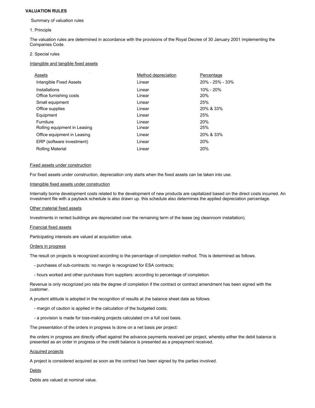 VALUATION RULES Summary of valuation rules 1. Principle The valuation rules are determined in accordance with the provisions of the Royal Decree of 30 January 2001 implementing the Companies Code. 2. Special rules Intangible and tangible fixed assets Assets Method depreciation Percentage Intangible Fixed Assets Linear 20% - 25% - 33% Installations Linear 10% - 20% Office furnishing costs Linear 20% Small equipment Linear 25% Office supplies Linear 20% & 33% Equipment Linear 25% Furniture Linear 20% Rolling equipment in Leasing Linear 25% Office equipment in Leasing Linear 20% & 33% ERP (software investment) Linear 20% Rolling Material Linear 20% Fixed assets under construction For fixed assets under construction, depreciation only starts when the fixed assets can be taken into use. Intangible fixed assets under construction Internally borne development costs related to the development of new products are capitalized based on the direct costs incurred. An investment file with a payback schedule is also drawn up. this schedule also determines the applied depreciation percentage. Other material fixed assets Investments in rented buildings are depreciated over the remaining term of the lease (eg cleanroom installation). Financial fixed assets Participating interests are valued at acquisition value. Orders in progress The result on projects is recognized according io the percentage of completion method. This is determined as follows. - purchases of sub-contracts: no margin is recognized for ESA contracts; - hours worked and other purchases from suppliers: according to percentage of completion. Revenue is only recognized pro rata the degree of completion if the contract or contract amendment has been signed with the customer. A prudent attitude is adopted in the recognition of results at (he balance sheet date as follows: - margin of caution is applied in the calculation of the budgeted costs; - a provision is made for loss-making projects calculated cm a full cost basis. The presentation of the orders in progress Is done on a net basis per project: the orders in progress are directly offset against the advance payments received per project, whereby either the debit balance is presented as an order in progress or the credit balance is presented as a prepayment received. Acquired projects A project is considered acquired as soon as the contract has been signed by the parties involved. Debts Debts are valued at nominal value.