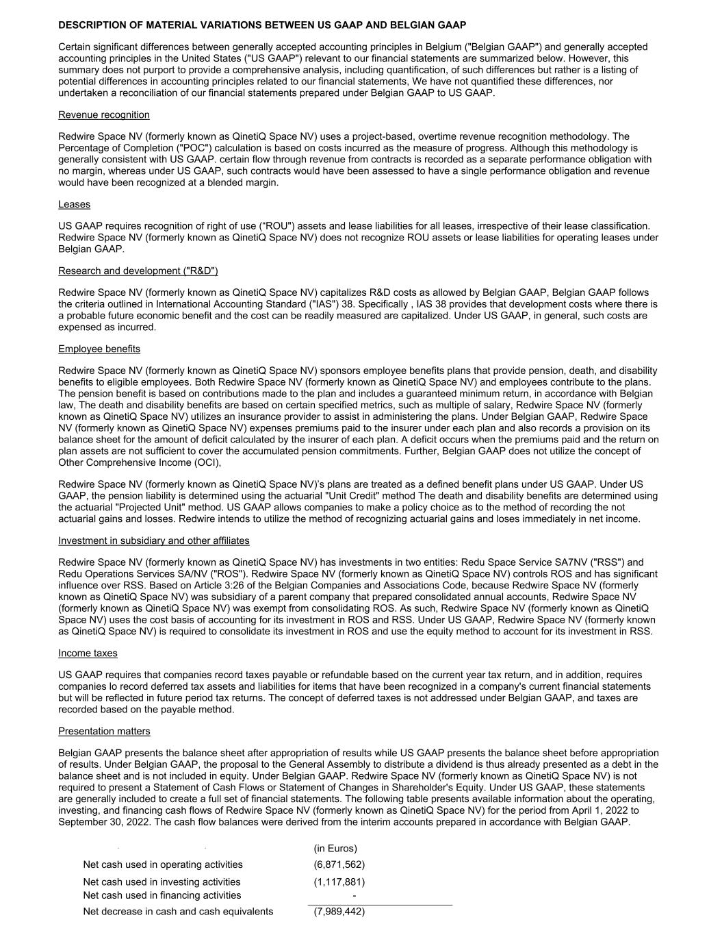 DESCRIPTION OF MATERIAL VARIATIONS BETWEEN US GAAP AND BELGIAN GAAP Certain significant differences between generally accepted accounting principles in Belgium ("Belgian GAAP") and generally accepted accounting principles in the United States ("US GAAP") relevant to our financial statements are summarized below. However, this summary does not purport to provide a comprehensive analysis, including quantification, of such differences but rather is a listing of potential differences in accounting principles related to our financial statements, We have not quantified these differences, nor undertaken a reconciliation of our financial statements prepared under Belgian GAAP to US GAAP. Revenue recognition Redwire Space NV (formerly known as QinetiQ Space NV) uses a project-based, overtime revenue recognition methodology. The Percentage of Completion ("POC") calculation is based on costs incurred as the measure of progress. Although this methodology is generally consistent with US GAAP. certain flow through revenue from contracts is recorded as a separate performance obligation with no margin, whereas under US GAAP, such contracts would have been assessed to have a single performance obligation and revenue would have been recognized at a blended margin. Leases US GAAP requires recognition of right of use (“ROU") assets and lease liabilities for all leases, irrespective of their lease classification. Redwire Space NV (formerly known as QinetiQ Space NV) does not recognize ROU assets or lease liabilities for operating leases under Belgian GAAP. Research and development ("R&D") Redwire Space NV (formerly known as QinetiQ Space NV) capitalizes R&D costs as allowed by Belgian GAAP, Belgian GAAP follows the criteria outlined in International Accounting Standard ("IAS") 38. Specifically , IAS 38 provides that development costs where there is a probable future economic benefit and the cost can be readily measured are capitalized. Under US GAAP, in general, such costs are expensed as incurred. Employee benefits Redwire Space NV (formerly known as QinetiQ Space NV) sponsors employee benefits plans that provide pension, death, and disability benefits to eligible employees. Both Redwire Space NV (formerly known as QinetiQ Space NV) and employees contribute to the plans. The pension benefit is based on contributions made to the plan and includes a guaranteed minimum return, in accordance with Belgian law, The death and disability benefits are based on certain specified metrics, such as multiple of salary, Redwire Space NV (formerly known as QinetiQ Space NV) utilizes an insurance provider to assist in administering the plans. Under Belgian GAAP, Redwire Space NV (formerly known as QinetiQ Space NV) expenses premiums paid to the insurer under each plan and also records a provision on its balance sheet for the amount of deficit calculated by the insurer of each plan. A deficit occurs when the premiums paid and the return on plan assets are not sufficient to cover the accumulated pension commitments. Further, Belgian GAAP does not utilize the concept of Other Comprehensive Income (OCI), Redwire Space NV (formerly known as QinetiQ Space NV)’s plans are treated as a defined benefit plans under US GAAP. Under US GAAP, the pension liability is determined using the actuarial "Unit Credit" method The death and disability benefits are determined using the actuarial "Projected Unit" method. US GAAP allows companies to make a policy choice as to the method of recording the not actuarial gains and losses. Redwire intends to utilize the method of recognizing actuarial gains and loses immediately in net income. Investment in subsidiary and other affiliates Redwire Space NV (formerly known as QinetiQ Space NV) has investments in two entities: Redu Space Service SA7NV ("RSS") and Redu Operations Services SA/NV ("ROS"). Redwire Space NV (formerly known as QinetiQ Space NV) controls ROS and has significant influence over RSS. Based on Article 3:26 of the Belgian Companies and Associations Code, because Redwire Space NV (formerly known as QinetiQ Space NV) was subsidiary of a parent company that prepared consolidated annual accounts, Redwire Space NV (formerly known as QinetiQ Space NV) was exempt from consolidating ROS. As such, Redwire Space NV (formerly known as QinetiQ Space NV) uses the cost basis of accounting for its investment in ROS and RSS. Under US GAAP, Redwire Space NV (formerly known as QinetiQ Space NV) is required to consolidate its investment in ROS and use the equity method to account for its investment in RSS. Income taxes US GAAP requires that companies record taxes payable or refundable based on the current year tax return, and in addition, requires companies lo record deferred tax assets and liabilities for items that have been recognized in a company's current financial statements but will be reflected in future period tax returns. The concept of deferred taxes is not addressed under Belgian GAAP, and taxes are recorded based on the payable method. Presentation matters Belgian GAAP presents the balance sheet after appropriation of results while US GAAP presents the balance sheet before appropriation of results. Under Belgian GAAP, the proposal to the General Assembly to distribute a dividend is thus already presented as a debt in the balance sheet and is not included in equity. Under Belgian GAAP. Redwire Space NV (formerly known as QinetiQ Space NV) is not required to present a Statement of Cash Flows or Statement of Changes in Shareholder's Equity. Under US GAAP, these statements are generally included to create a full set of financial statements. The following table presents available information about the operating, investing, and financing cash flows of Redwire Space NV (formerly known as QinetiQ Space NV) for the period from April 1, 2022 to September 30, 2022. The cash flow balances were derived from the interim accounts prepared in accordance with Belgian GAAP. (in Euros) Net cash used in ope
