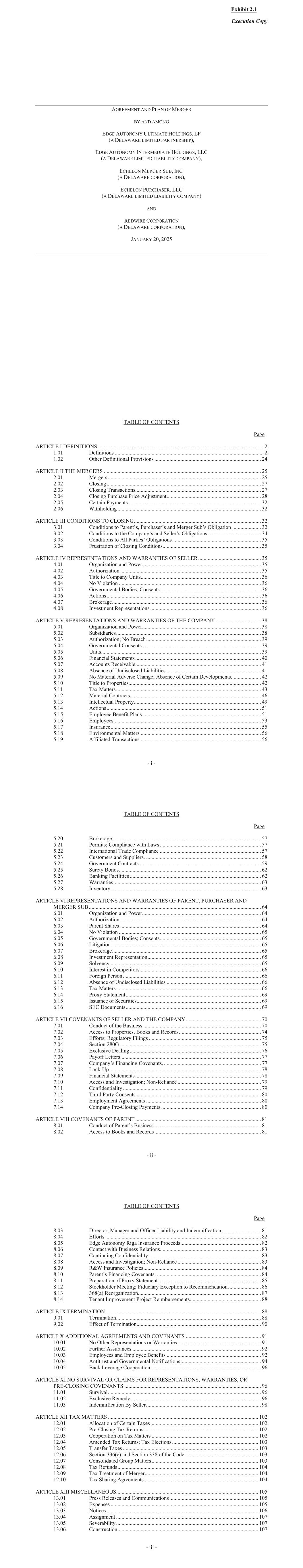 Execution Copy AGREEMENT AND PLAN OF MERGER BY AND AMONG EDGE AUTONOMY ULTIMATE HOLDINGS, LP (A DELAWARE LIMITED PARTNERSHIP), EDGE AUTONOMY INTERMEDIATE HOLDINGS, LLC (A DELAWARE LIMITED LIABILITY COMPANY), ECHELON MERGER SUB, INC. (A DELAWARE CORPORATION), ECHELON PURCHASER, LLC (A DELAWARE LIMITED LIABILITY COMPANY) AND REDWIRE CORPORATION (A DELAWARE CORPORATION), JANUARY 20, 2025 TABLE OF CONTENTS Page - i - ARTICLE I DEFINITIONS ......................................................................................................................... 2 1.01 Definitions ............................................................................................................. 2 1.02 Other Definitional Provisions .............................................................................. 24 ARTICLE II THE MERGERS ................................................................................................................... 25 2.01 Mergers ................................................................................................................ 25 2.02 Closing ................................................................................................................. 27 2.03 Closing Transactions............................................................................................ 27 2.04 Closing Purchase Price Adjustment ..................................................................... 28 2.05 Certain Payments ................................................................................................. 32 2.06 Withholding ......................................................................................................... 32 ARTICLE III CONDITIONS TO CLOSING ............................................................................................. 32 3.01 Conditions to Parent’s, Purchaser’s and Merger Sub’s Obligation ..................... 32 3.02 Conditions to the Company’s and Seller’s Obligations ....................................... 34 3.03 Conditions to All Parties’ Obligations ................................................................. 35 3.04 Frustration of Closing Conditions ........................................................................ 35 ARTICLE IV REPRESENTATIONS AND WARRANTIES OF SELLER .............................................. 35 4.01 Organization and Power ....................................................................................... 35 4.02 Authorization ....................................................................................................... 35 4.03 Title to Company Units ........................................................................................ 36 4.04 No Violation ........................................................................................................ 36 4.05 Governmental Bodies; Consents .......................................................................... 36 4.06 Actions ................................................................................................................. 36 4.07 Brokerage ............................................................................................................. 36 4.08 Investment Representations ................................................................................. 36 ARTICLE V REPRESENTATIONS AND WARRANTIES OF THE COMPANY ................................. 38 5.01 Organization and Power ....................................................................................... 38 5.02 Subsidiaries .......................................................................................................... 38 5.03 Authorization; No Breach .................................................................................... 39 5.04 Governmental Consents ....................................................................................... 39 5.05 Units ..................................................................................................................... 39 5.06 Financial Statements ............................................................................................ 40 5.07 Accounts Receivable ............................................................................................ 41 5.08 Absence of Undisclosed Liabilities ..................................................................... 41 5.09 No Material Adverse Change; Absence of Certain Developments ...................... 42 5.10 Title to Properties................................................................................................. 42 5.11 Tax Matters .......................................................................................................... 43 5.12 Material Contracts................................................................................................ 46 5.13 Intellectual Property ............................................................................................. 49 5.14 Actions ................................................................................................................. 51 5.15 Employee Benefit Plans ....................................................................................... 51 5.16 Employees ............................................................................................................ 53 5.17 Insurance .............................................................................................................. 55 5.18 Environmental Matters ........................................................................................ 56 5.19 Affiliated Transactions ........................................................................................ 56 TABLE OF CONTENTS Page - ii - 5.20 Brokerage ............................................................................................................. 57 5.21 Permits; Compliance with Laws .....................................................................