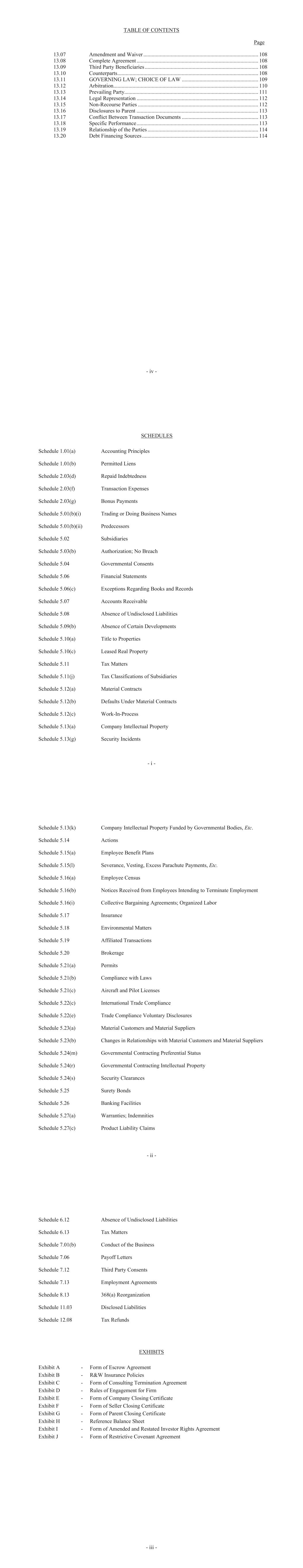 TABLE OF CONTENTS Page - iv - 13.07 Amendment and Waiver .................................................................................... 108 13.08 Complete Agreement ......................................................................................... 108 13.09 Third Party Beneficiaries ................................................................................... 108 13.10 Counterparts ....................................................................................................... 108 13.11 GOVERNING LAW; CHOICE OF LAW ........................................................ 109 13.12 Arbitration .......................................................................................................... 110 13.13 Prevailing Party.................................................................................................. 111 13.14 Legal Representation ......................................................................................... 112 13.15 Non-Recourse Parties ........................................................................................ 112 13.16 Disclosures to Parent ......................................................................................... 113 13.17 Conflict Between Transaction Documents ........................................................ 113 13.18 Specific Performance ......................................................................................... 113 13.19 Relationship of the Parties ................................................................................. 114 13.20 Debt Financing Sources ..................................................................................... 114 - i - SCHEDULES Schedule 1.01(a) Schedule 1.01(b) Schedule 2.03(d) Schedule 2.03(f) Schedule 2.03(g) Schedule 5.01(b)(i) Schedule 5.01(b)(ii) Schedule 5.02 Schedule 5.03(b) Schedule 5.04 Schedule 5.06 Schedule 5.06(c) Schedule 5.07 Schedule 5.08 Schedule 5.09(b) Schedule 5.10(a) Schedule 5.10(c) Schedule 5.11 Schedule 5.11(j) Schedule 5.12(a) Schedule 5.12(b) Schedule 5.12(c) Schedule 5.13(a) Schedule 5.13(g) Accounting Principles Permitted Liens Repaid Indebtedness Transaction Expenses Bonus Payments Trading or Doing Business Names Predecessors Subsidiaries Authorization; No Breach Governmental Consents Financial Statements Exceptions Regarding Books and Records Accounts Receivable Absence of Undisclosed Liabilities Absence of Certain Developments Title to Properties Leased Real Property Tax Matters Tax Classifications of Subsidiaries Material Contracts Defaults Under Material Contracts Work-In-Process Company Intellectual Property Security Incidents - ii - Schedule 5.13(k) Schedule 5.14 Schedule 5.15(a) Schedule 5.15(l) Schedule 5.16(a) Schedule 5.16(b) Schedule 5.16(i) Schedule 5.17 Schedule 5.18 Schedule 5.19 Schedule 5.20 Schedule 5.21(a) Schedule 5.21(b) Schedule 5.21(c) Schedule 5.22(c) Schedule 5.22(e) Schedule 5.23(a) Schedule 5.23(b) Schedule 5.24(m) Schedule 5.24(r) Schedule 5.24(s) Schedule 5.25 Schedule 5.26 Schedule 5.27(a) Schedule 5.27(c) Company Intellectual Property Funded by Governmental Bodies, Etc. Actions Employee Benefit Plans Severance, Vesting, Excess Parachute Payments, Etc. Employee Census Notices Received from Employees Intending to Terminate Employment Collective Bargaining Agreements; Organized Labor Insurance Environmental Matters Affiliated Transactions Brokerage Permits Compliance with Laws Aircraft and Pilot Licenses International Trade Compliance Trade Compliance Voluntary Disclosures Material Customers and Material Suppliers Changes in Relationships with Material Customers and Material Suppliers Governmental Contracting Preferential Status Governmental Contracting Intellectual Property Security Clearances Surety Bonds Banking Facilities Warranties; Indemnities Product Liability Claims - iii - Schedule 6.12 Schedule 6.13 Schedule 7.01(b) Schedule 7.06 Schedule 7.12 Schedule 7.13 Schedule 8.13 Schedule 11.03 Schedule 12.08 Absence of Undisclosed Liabilities Tax Matters Conduct of the Business Payoff Letters Third Party Consents Employment Agreements 368(a) Reorganization Disclosed Liabilities Tax Refunds EXHIBITS Exhibit A - Form of Escrow Agreement Exhibit B - R&W Insurance Policies Exhibit C - Form of Consulting Termination Agreement Exhibit D - Rules of Engagement for Firm Exhibit E - Form of Company Closing Certificate Exhibit F - Form of Seller Closing Certificate Exhibit G - Form of Parent Closing Certificate Exhibit H - Reference Balance Sheet Exhibit I - Form of Amended and Restated Investor Rights Agreement Exhibit J - Form of Restrictive Covenant Agreement