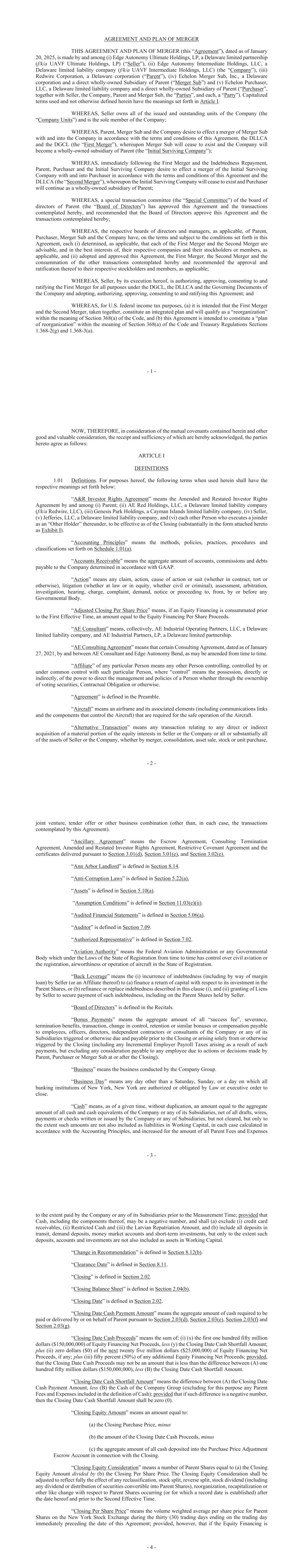 - 1 - AGREEMENT AND PLAN OF MERGER THIS AGREEMENT AND PLAN OF MERGER (this “Agreement”), dated as of January 20, 2025, is made by and among (i) Edge Autonomy Ultimate Holdings, LP, a Delaware limited partnership (f/k/a UAVF Ultimate Holdings, LP) (“Seller”), (ii) Edge Autonomy Intermediate Holdings, LLC, a Delaware limited liability company (f/k/a UAVF Intermediate Holdings, LLC) (the “Company”), (iii) Redwire Corporation, a Delaware corporation (“Parent”), (iv) Echelon Merger Sub, Inc., a Delaware corporation and a direct wholly-owned Subsidiary of Parent (“Merger Sub”) and (v) Echelon Purchaser, LLC, a Delaware limited liability company and a direct wholly-owned Subsidiary of Parent (“Purchaser”, together with Seller, the Company, Parent and Merger Sub, the “Parties”, and each, a “Party”). Capitalized terms used and not otherwise defined herein have the meanings set forth in Article I. WHEREAS, Seller owns all of the issued and outstanding units of the Company (the “Company Units”) and is the sole member of the Company; WHEREAS, Parent, Merger Sub and the Company desire to effect a merger of Merger Sub with and into the Company in accordance with the terms and conditions of this Agreement, the DLLCA and the DGCL (the “First Merger”), whereupon Merger Sub will cease to exist and the Company will become a wholly-owned subsidiary of Parent (the “Initial Surviving Company”); WHEREAS, immediately following the First Merger and the Indebtedness Repayment, Parent, Purchaser and the Initial Surviving Company desire to effect a merger of the Initial Surviving Company with and into Purchaser in accordance with the terms and conditions of this Agreement and the DLLCA (the “Second Merger”), whereupon the Initial Surviving Company will cease to exist and Purchaser will continue as a wholly-owned subsidiary of Parent; WHEREAS, a special transaction committee (the “Special Committee”) of the board of directors of Parent (the “Board of Directors”) has approved this Agreement and the transactions contemplated hereby, and recommended that the Board of Directors approve this Agreement and the transactions contemplated hereby; WHEREAS, the respective boards of directors and managers, as applicable, of Parent, Purchaser, Merger Sub and the Company have, on the terms and subject to the conditions set forth in this Agreement, each (i) determined, as applicable, that each of the First Merger and the Second Merger are advisable, and in the best interests of, their respective companies and their stockholders or members, as applicable, and (ii) adopted and approved this Agreement, the First Merger, the Second Merger and the consummation of the other transactions contemplated hereby and recommended the approval and ratification thereof to their respective stockholders and members, as applicable; WHEREAS, Seller, by its execution hereof, is authorizing, approving, consenting to and ratifying the First Merger for all purposes under the DGCL, the DLLCA and the Governing Documents of the Company and adopting, authorizing, approving, consenting to and ratifying this Agreement; and WHEREAS, for U.S. federal income tax purposes, (a) it is intended that the First Merger and the Second Merger, taken together, constitute an integrated plan and will qualify as a “reorganization” within the meaning of Section 368(a) of the Code, and (b) this Agreement is intended to constitute a “plan of reorganization” within the meaning of Section 368(a) of the Code and Treasury Regulations Sections 1.368-2(g) and 1.368-3(a). - 2 - NOW, THEREFORE, in consideration of the mutual covenants contained herein and other good and valuable consideration, the receipt and sufficiency of which are hereby acknowledged, the parties hereto agree as follows: ARTICLE I DEFINITIONS 1.01 Definitions. For purposes hereof, the following terms when used herein shall have the respective meanings set forth below: “A&R Investor Rights Agreement” means the Amended and Restated Investor Rights Agreement by and among (i) Parent; (ii) AE Red Holdings, LLC, a Delaware limited liability company (f/k/a Redwire, LLC), (iii) Genesis Park Holdings, a Cayman Islands limited liability company, (iv) Seller, (v) Jefferies, LLC, a Delaware limited liability company, and (vi) each other Person who executes a joinder as an “Other Holder” thereunder, to be effective as of the Closing (substantially in the form attached hereto as Exhibit I). “Accounting Principles” means the methods, policies, practices, procedures and classifications set forth on Schedule 1.01(a). “Accounts Receivable” means the aggregate amount of accounts, commissions and debts payable to the Company determined in accordance with GAAP. “Action” means any claim, action, cause of action or suit (whether in contract, tort or otherwise), litigation (whether at law or in equity, whether civil or criminal), assessment, arbitration, investigation, hearing, charge, complaint, demand, notice or proceeding to, from, by or before any Governmental Body. “Adjusted Closing Per Share Price” means, if an Equity Financing is consummated prior to the First Effective Time, an amount equal to the Equity Financing Per Share Proceeds. “AE Consultant” means, collectively, AE Industrial Operating Partners, LLC, a Delaware limited liability company, and AE Industrial Partners, LP, a Delaware limited partnership. “AE Consulting Agreement” means that certain Consulting Agreement, dated as of January 27, 2021, by and between AE Consultant and Edge Autonomy Bend, as may be amended from time to time. “Affiliate” of any particular Person means any other Person controlling, controlled by or under common control with such particular Person, where “control” means the possession, directly or indirectly, of the power to direct the management and policies of a Person whether through the ownership of voting securities, Contractual Obligation or ot