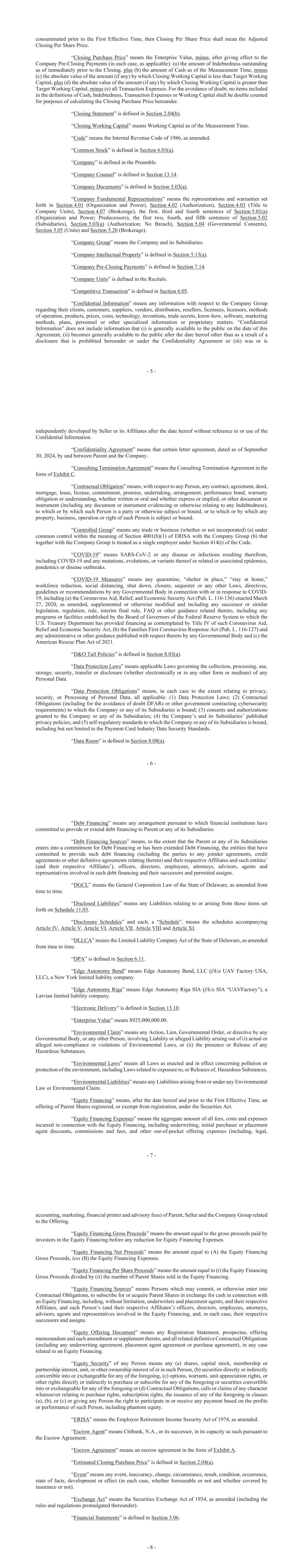 - 5 - consummated prior to the First Effective Time, then Closing Per Share Price shall mean the Adjusted Closing Per Share Price. “Closing Purchase Price” means the Enterprise Value, minus, after giving effect to the Company Pre-Closing Payments (in each case, as applicable): (a) the amount of Indebtedness outstanding as of immediately prior to the Closing, plus (b) the amount of Cash as of the Measurement Time, minus (c) the absolute value of the amount (if any) by which Closing Working Capital is less than Target Working Capital, plus (d) the absolute value of the amount (if any) by which Closing Working Capital is greater than Target Working Capital, minus (e) all Transaction Expenses. For the avoidance of doubt, no items included in the definitions of Cash, Indebtedness, Transaction Expenses or Working Capital shall be double counted for purposes of calculating the Closing Purchase Price hereunder. “Closing Statement” is defined in Section 2.04(b). “Closing Working Capital” means Working Capital as of the Measurement Time. “Code” means the Internal Revenue Code of 1986, as amended. “Common Stock” is defined in Section 6.03(a). “Company” is defined in the Preamble. “Company Counsel” is defined in Section 13.14. “Company Documents” is defined in Section 5.03(a). “Company Fundamental Representations” means the representations and warranties set forth in Section 4.01 (Organization and Power), Section 4.02 (Authorization), Section 4.03 (Title to Company Units), Section 4.07 (Brokerage), the first, third and fourth sentences of Section 5.01(a) (Organization and Power; Predecessors), the first two, fourth, and fifth sentences of Section 5.02 (Subsidiaries), Section 5.03(a) (Authorization; No Breach), Section 5.04 (Governmental Consents), Section 5.05 (Units) and Section 5.20 (Brokerage). “Company Group” means the Company and its Subsidiaries. “Company Intellectual Property” is defined in Section 5.13(a). “Company Pre-Closing Payments” is defined in Section 7.14. “Company Units” is defined in the Recitals. “Competitive Transaction” is defined in Section 6.05. “Confidential Information” means any information with respect to the Company Group regarding their clients, customers, suppliers, vendors, distributors, resellers, licensees, licensors, methods of operation, products, prices, costs, technology, inventions, trade secrets, know-how, software, marketing methods, plans, personnel or other specialized information or proprietary matters. “Confidential Information” does not include information that (i) is generally available to the public on the date of this Agreement, (ii) becomes generally available to the public after the date hereof other than as a result of a disclosure that is prohibited hereunder or under the Confidentiality Agreement or (iii) was or is - 6 - independently developed by Seller or its Affiliates after the date hereof without reference to or use of the Confidential Information. “Confidentiality Agreement” means that certain letter agreement, dated as of September 30, 2024, by and between Parent and the Company. “Consulting Termination Agreement” means the Consulting Termination Agreement in the form of Exhibit C. “Contractual Obligation” means, with respect to any Person, any contract, agreement, deed, mortgage, lease, license, commitment, promise, undertaking, arrangement, performance bond, warranty obligation or understanding, whether written or oral and whether express or implied, or other document or instrument (including any document or instrument evidencing or otherwise relating to any Indebtedness), to which or by which such Person is a party or otherwise subject or bound, or to which or by which any property, business, operation or right of such Person is subject or bound. “Controlled Group” means any trade or business (whether or not incorporated) (a) under common control within the meaning of Section 4001(b)(1) of ERISA with the Company Group (b) that together with the Company Group is treated as a single employer under Section 414(t) of the Code. “COVID-19” means SARS-CoV-2 or any disease or infections resulting therefrom, including COVID-19 and any mutations, evolutions, or variants thereof or related or associated epidemics, pandemics or disease outbreaks. “COVID-19 Measures” means any quarantine, “shelter in place,” “stay at home,” workforce reduction, social distancing, shut down, closure, sequester or any other Laws, directives, guidelines or recommendations by any Governmental Body in connection with or in response to COVID- 19, including (a) the Coronavirus Aid, Relief, and Economic Security Act (Pub. L. 116-136) enacted March 27, 2020, as amended, supplemented or otherwise modified and including any successor or similar legislation, regulation, rule, interim final rule, FAQ or other guidance related thereto, including any programs or facilities established by the Board of Governors of the Federal Reserve System to which the U.S. Treasury Department has provided financing as contemplated by Title IV of such Coronavirus Aid, Relief and Economic Security Act, (b) the Families First Coronavirus Response Act (Pub. L. 116-127) and any administrative or other guidance published with respect thereto by any Governmental Body and (c) the American Rescue Plan Act of 2021. “D&O Tail Policies” is defined in Section 8.03(a). “Data Protection Laws” means applicable Laws governing the collection, processing, use, storage, security, transfer or disclosure (whether electronically or in any other form or medium) of any Personal Data. “Data Protection Obligations” means, in each case to the extent relating to privacy, security, or Processing of Personal Data, all applicable: (1) Data Protection Laws; (2) Contractual Obligations (including for the avoidance of doubt DFARs or other government contracting cybersecurity requirements) to which the Company or any of its Su
