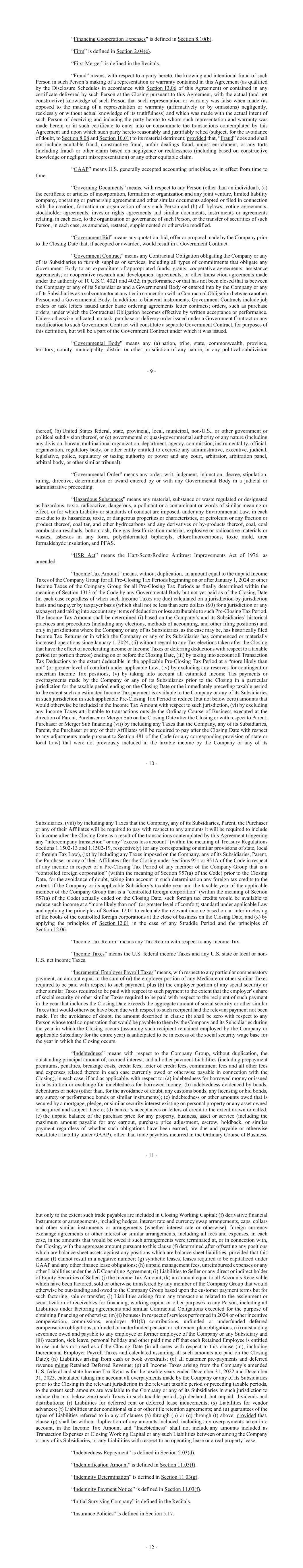 - 9 - “Financing Cooperation Expenses” is defined in Section 8.10(b). “Firm” is defined in Section 2.04(e). “First Merger” is defined in the Recitals. “Fraud” means, with respect to a party hereto, the knowing and intentional fraud of such Person in such Person’s making of a representation or warranty contained in this Agreement (as qualified by the Disclosure Schedules in accordance with Section 13.06 of this Agreement) or contained in any certificate delivered by such Person at the Closing pursuant to this Agreement, with the actual (and not constructive) knowledge of such Person that such representation or warranty was false when made (as opposed to the making of a representation or warranty (affirmatively or by omissions) negligently, recklessly or without actual knowledge of its truthfulness) and which was made with the actual intent of such Person of deceiving and inducing the party hereto to whom such representation and warranty was made herein or in such certificate to enter into or consummate the transactions contemplated by this Agreement and upon which such party hereto reasonably and justifiably relied (subject, for the avoidance of doubt, to Section 8.08 and Section 10.01) to its material detriment; provided that, “Fraud” does and shall not include equitable fraud, constructive fraud, unfair dealings fraud, unjust enrichment, or any torts (including fraud) or other claim based on negligence or recklessness (including based on constructive knowledge or negligent misrepresentation) or any other equitable claim. “GAAP” means U.S. generally accepted accounting principles, as in effect from time to time. “Governing Documents” means, with respect to any Person (other than an individual), (a) the certificate or articles of incorporation, formation or organization and any joint venture, limited liability company, operating or partnership agreement and other similar documents adopted or filed in connection with the creation, formation or organization of any such Person and (b) all bylaws, voting agreements, stockholder agreements, investor rights agreements and similar documents, instruments or agreements relating, in each case, to the organization or governance of such Person, or the transfer of securities of such Person, in each case, as amended, restated, supplemented or otherwise modified. “Government Bid” means any quotation, bid, offer or proposal made by the Company prior to the Closing Date that, if accepted or awarded, would result in a Government Contract. “Government Contract” means any Contractual Obligation obligating the Company or any of its Subsidiaries to furnish supplies or services, including all types of commitments that obligate any Government Body to an expenditure of appropriated funds; grants; cooperative agreements; assistance agreements; or cooperative research and development agreements; or other transaction agreements made under the authority of 10 U.S.C. 4021 and 4022; in performance or that has not been closed that is between the Company or any of its Subsidiaries and a Governmental Body or entered into by the Company or any of its Subsidiaries as a subcontractor at any tier in connection with a Contractual Obligation between another Person and a Governmental Body. In addition to bilateral instruments, Government Contracts include job orders or task letters issued under basic ordering agreements letter contracts; orders, such as purchase orders, under which the Contractual Obligation becomes effective by written acceptance or performance. Unless otherwise indicated, no task, purchase or delivery order issued under a Government Contract or any modification to such Government Contract will constitute a separate Government Contract, for purposes of this definition, but will be a part of the Government Contract under which it was issued. “Governmental Body” means any (a) nation, tribe, state, commonwealth, province, territory, county, municipality, district or other jurisdiction of any nature, or any political subdivision - 10 - thereof, (b) United States federal, state, provincial, local, municipal, non-U.S., or other government or political subdivision thereof, or (c) governmental or quasi-governmental authority of any nature (including any division, bureau, multinational organization, department, agency, commission, instrumentality, official, organization, regulatory body, or other entity entitled to exercise any administrative, executive, judicial, legislative, police, regulatory or taxing authority or power and any court, arbitrator, arbitration panel, arbitral body, or other similar tribunal). “Governmental Order” means any order, writ, judgment, injunction, decree, stipulation, ruling, directive, determination or award entered by or with any Governmental Body in a judicial or administrative proceeding. “Hazardous Substances” means any material, substance or waste regulated or designated as hazardous, toxic, radioactive, dangerous, a pollutant or a contaminant or words of similar meaning or effect, or for which Liability or standards of conduct are imposed, under any Environmental Law, in each case due to its hazardous, toxic, or dangerous properties or characteristics, or petroleum or any fraction or product thereof, coal tar, and other hydrocarbons and any derivatives or by-products thereof, coal, coal combustion residuals, bottom ash, flue gas desulfurization material, explosive or radioactive materials or wastes, asbestos in any form, polychlorinated biphenyls, chlorofluorocarbons, toxic mold, urea formaldehyde insulation, and PFAS. “HSR Act” means the Hart-Scott-Rodino Antitrust Improvements Act of 1976, as amended. “Income Tax Amount” means, without duplication, an amount equal to the unpaid Income Taxes of the Company Group for all Pre-Closing Tax Periods beginning on or after January 1, 2024 or other Income Taxes of the Company Group for all Pre-Closing Tax Periods as finally determined 