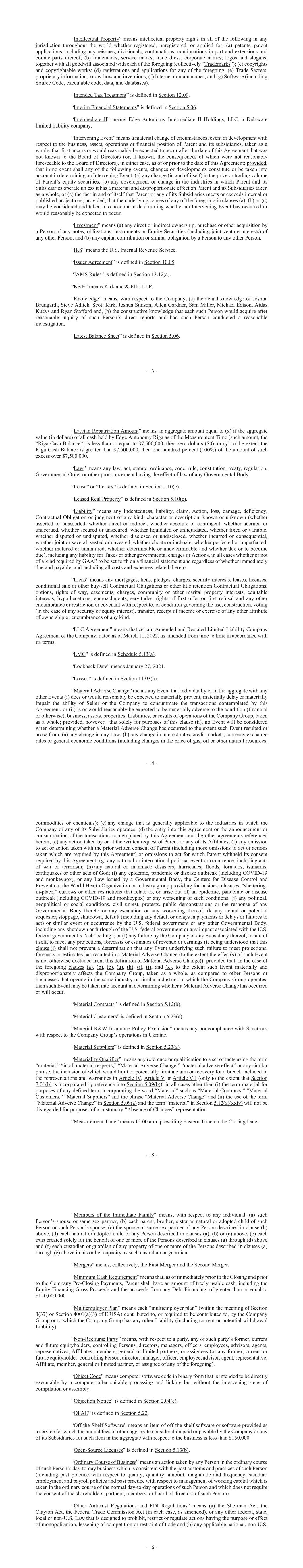 - 13 - “Intellectual Property” means intellectual property rights in all of the following in any jurisdiction throughout the world whether registered, unregistered, or applied for: (a) patents, patent applications, including any reissues, divisionals, continuations, continuations-in-part and extensions and counterparts thereof; (b) trademarks, service marks, trade dress, corporate names, logos and slogans, together with all goodwill associated with each of the foregoing (collectively “Trademarks”); (c) copyrights and copyrightable works; (d) registrations and applications for any of the foregoing; (e) Trade Secrets, proprietary information, know-how and inventions; (f) Internet domain names; and (g) Software (including Source Code, executable code, data, and databases). “Intended Tax Treatment” is defined in Section 12.09. “Interim Financial Statements” is defined in Section 5.06. “Intermediate II” means Edge Autonomy Intermediate II Holdings, LLC, a Delaware limited liability company. “Intervening Event” means a material change of circumstances, event or development with respect to the business, assets, operations or financial position of Parent and its subsidiaries, taken as a whole, that first occurs or would reasonably be expected to occur after the date of this Agreement that was not known to the Board of Directors (or, if known, the consequences of which were not reasonably foreseeable to the Board of Directors), in either case, as of or prior to the date of this Agreement; provided, that in no event shall any of the following events, changes or developments constitute or be taken into account in determining an Intervening Event: (a) any change (in and of itself) in the price or trading volume of Parent’s equity securities, (b) any development or change in the industries in which Parent and its Subsidiaries operate unless it has a material and disproportionate effect on Parent and its Subsidiaries taken as a whole, or (c) the fact in and of itself that Parent or any of its Subsidiaries meets or exceeds internal or published projections; provided, that the underlying causes of any of the foregoing in clauses (a), (b) or (c) may be considered and taken into account in determining whether an Intervening Event has occurred or would reasonably be expected to occur. “Investment” means (a) any direct or indirect ownership, purchase or other acquisition by a Person of any notes, obligations, instruments or Equity Securities (including joint venture interests) of any other Person; and (b) any capital contribution or similar obligation by a Person to any other Person. “IRS” means the U.S. Internal Revenue Service. “Issuer Agreement” is defined in Section 10.05. “JAMS Rules” is defined in Section 13.12(a). “K&E” means Kirkland & Ellis LLP. “Knowledge” means, with respect to the Company, (a) the actual knowledge of Joshua Brungardt, Steve Adlich, Scott Kirk, Joshua Stinson, Allen Gardner, Sam Miller, Michael Edison, Aidas and, (b) the constructive knowledge that each such Person would acquire after reasonable inquiry of such Person’s direct reports and had such Person conducted a reasonable investigation. “Latest Balance Sheet” is defined in Section 5.06. - 14 - “Latvian Repatriation Amount” means an aggregate amount equal to (x) if the aggregate value (in dollars) of all cash held by Edge Autonomy Riga as of the Measurement Time (such amount, the “Riga Cash Balance”) is less than or equal to $7,500,000, then zero dollars ($0), or (y) to the extent the Riga Cash Balance is greater than $7,500,000, then one hundred percent (100%) of the amount of such excess over $7,500,000. “Law” means any law, act, statute, ordinance, code, rule, constitution, treaty, regulation, Governmental Order or other pronouncement having the effect of law of any Governmental Body. “Lease” or “Leases” is defined in Section 5.10(c). “Leased Real Property” is defined in Section 5.10(c). “Liability” means any Indebtedness, liability, claim, Action, loss, damage, deficiency, Contractual Obligation or judgment of any kind, character or description, known or unknown (whether asserted or unasserted, whether direct or indirect, whether absolute or contingent, whether accrued or unaccrued, whether secured or unsecured, whether liquidated or unliquidated, whether fixed or variable, whether disputed or undisputed, whether disclosed or undisclosed, whether incurred or consequential, whether joint or several, vested or unvested, whether choate or inchoate, whether perfected or unperfected, whether matured or unmatured, whether determinable or undeterminable and whether due or to become due), including any liability for Taxes or other governmental charges or Actions, in all cases whether or not of a kind required by GAAP to be set forth on a financial statement and regardless of whether immediately due and payable, and including all costs and expenses related thereto. “Liens” means any mortgages, liens, pledges, charges, security interests, leases, licenses, conditional sale or other buy/sell Contractual Obligations or other title retention Contractual Obligations, options, rights of way, easements, charges, community or other marital property interests, equitable interests, hypothecations, encroachments, servitudes, rights of first offer or first refusal and any other encumbrance or restriction or covenant with respect to, or condition governing the use, construction, voting (in the case of any security or equity interest), transfer, receipt of income or exercise of any other attribute of ownership or encumbrances of any kind. “LLC Agreement” means that certain Amended and Restated Limited Liability Company Agreement of the Company, dated as of March 11, 2022, as amended from time to time in accordance with its terms. “LMC” is defined in Schedule 5.13(a). “Lookback Date” means January 27, 2021. “Losses” is defined in Section 11.03