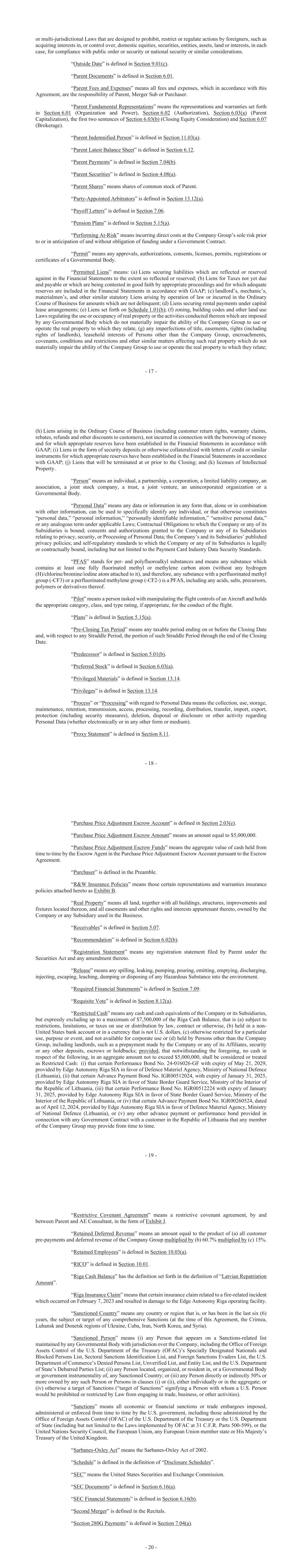 - 17 - or multi-jurisdictional Laws that are designed to prohibit, restrict or regulate actions by foreigners, such as acquiring interests in, or control over, domestic equities, securities, entities, assets, land or interests, in each case, for compliance with public order or security or national security or similar considerations. “Outside Date” is defined in Section 9.01(c). “Parent Documents” is defined in Section 6.01. “Parent Fees and Expenses” means all fees and expenses, which in accordance with this Agreement, are the responsibility of Parent, Merger Sub or Purchaser. “Parent Fundamental Representations” means the representations and warranties set forth in Section 6.01 (Organization and Power), Section 6.02 (Authorization), Section 6.03(a) (Parent Capitalization), the first two sentences of Section 6.03(b) (Closing Equity Consideration) and Section 6.07 (Brokerage). “Parent Indemnified Person” is defined in Section 11.03(a). “Parent Latest Balance Sheet” is defined in Section 6.12. “Parent Payments” is defined in Section 7.04(b). “Parent Securities” is defined in Section 4.08(a). “Parent Shares” means shares of common stock of Parent. “Party-Appointed Arbitrators” is defined in Section 13.12(a). “Payoff Letters” is defined in Section 7.06. “Pension Plans” is defined in Section 5.15(a). “Performing At-Risk” means incurring direct costs at the Company Group’s sole risk prior to or in anticipation of and without obligation of funding under a Government Contract. “Permit” means any approvals, authorizations, consents, licenses, permits, registrations or certificates of a Governmental Body. “Permitted Liens” means: (a) Liens securing liabilities which are reflected or reserved against in the Financial Statements to the extent so reflected or reserved; (b) Liens for Taxes not yet due and payable or which are being contested in good faith by appropriate proceedings and for which adequate reserves are included in the Financial Statements in accordance with GAAP; (c) landlord’s, mechanic’s, materialmen’s, and other similar statutory Liens arising by operation of law or incurred in the Ordinary Course of Business for amounts which are not delinquent; (d) Liens securing rental payments under capital lease arrangements; (e) Liens set forth on Schedule 1.01(b); (f) zoning, building codes and other land use Laws regulating the use or occupancy of real property or the activities conducted thereon which are imposed by any Governmental Body which do not materially impair the ability of the Company Group to use or operate the real property to which they relate, (g) any imperfections of title, easements, rights (including rights of landlords), leasehold interests of Persons other than the Company Group, encroachments, covenants, conditions and restrictions and other similar matters affecting such real property which do not materially impair the ability of the Company Group to use or operate the real property to which they relate; - 18 - (h) Liens arising in the Ordinary Course of Business (including customer return rights, warranty claims, rebates, refunds and other discounts to customers), not incurred in connection with the borrowing of money and for which appropriate reserves have been established in the Financial Statements in accordance with GAAP; (i) Liens in the form of security deposits or otherwise collateralized with letters of credit or similar instruments for which appropriate reserves have been established in the Financial Statements in accordance with GAAP; (j) Liens that will be terminated at or prior to the Closing; and (k) licenses of Intellectual Property. “Person” means an individual, a partnership, a corporation, a limited liability company, an association, a joint stock company, a trust, a joint venture, an unincorporated organization or a Governmental Body. “Personal Data” means any data or information in any form that, alone or in combination with other information, can be used to specifically identify any individual, or that otherwise constitutes “personal data,” “personal information,” “personally identifiable information,” “sensitive personal data,” or any analogous term under applicable Laws; Contractual Obligations to which the Company or any of its Subsidiaries is bound; consents and authorizations granted to the Company or any of its Subsidiaries relating to privacy, security, or Processing of Personal Data; the Company’s and its Subsidiaries’ published privacy policies; and self-regulatory standards to which the Company or any of its Subsidiaries is legally or contractually bound, including but not limited to the Payment Card Industry Data Security Standards. “PFAS” stands for per- and polyfluoroalkyl substances and means any substance which contains at least one fully fluorinated methyl or methylene carbon atom (without any hydrogen (H)/chlorine/bromine/iodine atom attached to it), and therefore, any substance with a perfluorinated methyl group (-CF3) or a perfluorinated methylene group (-CF2-) is a PFAS, including any acids, salts, precursors, polymers or derivatives thereof. “Pilot” means a person tasked with manipulating the flight controls of an Aircraft and holds the appropriate category, class, and type rating, if appropriate, for the conduct of the flight. “Plans” is defined in Section 5.15(a). “Pre-Closing Tax Period” means any taxable period ending on or before the Closing Date and, with respect to any Straddle Period, the portion of such Straddle Period through the end of the Closing Date. “Predecessor” is defined in Section 5.01(b). “Preferred Stock” is defined in Section 6.03(a). “Privileged Materials” is defined in Section 13.14. “Privileges” is defined in Section 13.14. “Process” or “Processing” with regard to Personal Data means the collection, use, storage, maintenance, retention, transmission, access, processing, r
