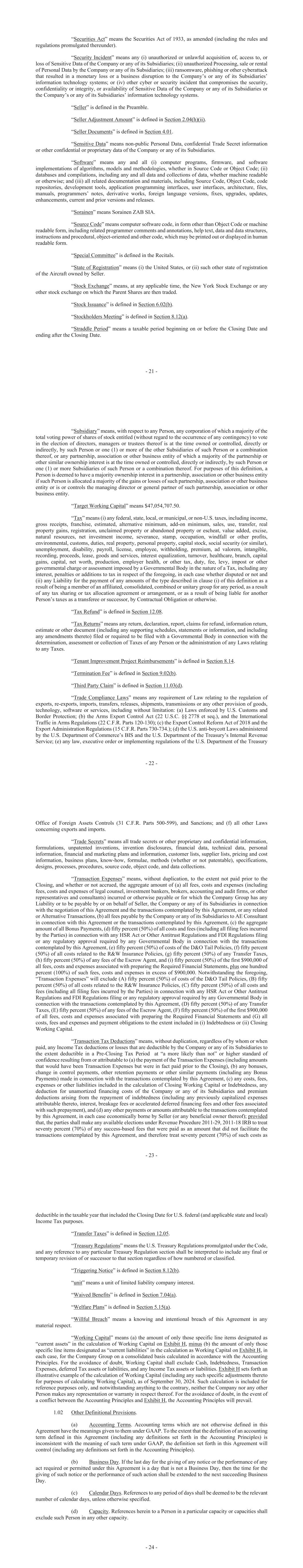 - 21 - “Securities Act” means the Securities Act of 1933, as amended (including the rules and regulations promulgated thereunder). “Security Incident” means any (i) unauthorized or unlawful acquisition of, access to, or loss of Sensitive Data of the Company or any of its Subsidiaries; (ii) unauthorized Processing, sale or rental of Personal Data by the Company or any of its Subsidiaries; (iii) ransomware, phishing or other cyberattack that resulted in a monetary loss or a business disruption to the Company’s or any of its Subsidiaries’ information technology systems; or (iv) other cyber or security incident that compromises the security, confidentiality or integrity, or availability of Sensitive Data of the Company or any of its Subsidiaries or the Company’s or any of its Subsidiaries’ information technology systems. “Seller” is defined in the Preamble. “Seller Adjustment Amount” is defined in Section 2.04(h)(ii). “Seller Documents” is defined in Section 4.01. “Sensitive Data” means non-public Personal Data, confidential Trade Secret information or other confidential or proprietary data of the Company or any of its Subsidiaries. “Software” means any and all (i) computer programs, firmware, and software implementations of algorithms, models and methodologies, whether in Source Code or Object Code; (ii) databases and compilations, including any and all data and collections of data, whether machine readable or otherwise; and (iii) all related documentation and materials, including Source Code, Object Code, code repositories, development tools, application programming interfaces, user interfaces, architecture, files, manuals, programmers’ notes, derivative works, foreign language versions, fixes, upgrades, updates, enhancements, current and prior versions and releases. “Sorainen” means Sorainen ZAB SIA. “Source Code” means computer software code, in form other than Object Code or machine readable form, including related programmer comments and annotations, help text, data and data structures, instructions and procedural, object-oriented and other code, which may be printed out or displayed in human readable form. “Special Committee” is defined in the Recitals. “State of Registration” means (i) the United States, or (ii) such other state of registration of the Aircraft owned by Seller. “Stock Exchange” means, at any applicable time, the New York Stock Exchange or any other stock exchange on which the Parent Shares are then traded. “Stock Issuance” is defined in Section 6.02(b). “Stockholders Meeting” is defined in Section 8.12(a). “Straddle Period” means a taxable period beginning on or before the Closing Date and ending after the Closing Date. - 22 - “Subsidiary” means, with respect to any Person, any corporation of which a majority of the total voting power of shares of stock entitled (without regard to the occurrence of any contingency) to vote in the election of directors, managers or trustees thereof is at the time owned or controlled, directly or indirectly, by such Person or one (1) or more of the other Subsidiaries of such Person or a combination thereof, or any partnership, association or other business entity of which a majority of the partnership or other similar ownership interest is at the time owned or controlled, directly or indirectly, by such Person or one (1) or more Subsidiaries of such Person or a combination thereof. For purposes of this definition, a Person is deemed to have a majority ownership interest in a partnership, association or other business entity if such Person is allocated a majority of the gains or losses of such partnership, association or other business entity or is or controls the managing director or general partner of such partnership, association or other business entity. “Target Working Capital” means $47,054,707.50. “Tax” means (i) any federal, state, local, or municipal, or non-U.S. taxes, including income, gross receipts, franchise, estimated, alternative minimum, add-on minimum, sales, use, transfer, real property gains, registration, unclaimed property or abandoned property or escheat, value added, excise, natural resources, net investment income, severance, stamp, occupation, windfall or other profits, environmental, customs, duties, real property, personal property, capital stock, social security (or similar), unemployment, disability, payroll, license, employee, withholding, premium, ad valorem, intangible, recording, proceeds, lease, goods and services, interest equalization, turnover, healthcare, branch, capital gains, capital, net worth, production, employer health, or other tax, duty, fee, levy, impost or other governmental charge or assessment imposed by a Governmental Body in the nature of a Tax, including any interest, penalties or additions to tax in respect of the foregoing, in each case whether disputed or not and (ii) any Liability for the payment of any amounts of the type described in clause (i) of this definition as a result of being a member of an affiliated, consolidated, combined or unitary group for any period, as a result of any tax sharing or tax allocation agreement or arrangement, or as a result of being liable for another Person’s taxes as a transferee or successor, by Contractual Obligation or otherwise. “Tax Refund” is defined in Section 12.08. “Tax Returns” means any return, declaration, report, claims for refund, information return, estimate or other document (including any supporting schedules, statements or information, and including any amendments thereto) filed or required to be filed with a Governmental Body in connection with the determination, assessment or collection of Taxes of any Person or the administration of any Laws relating to any Taxes. “Tenant Improvement Project Reimbursements” is defined in Section 8.14. “Termination Fee” is defined in Section 9.02(b). “Third Party Claim” is defined in Section 