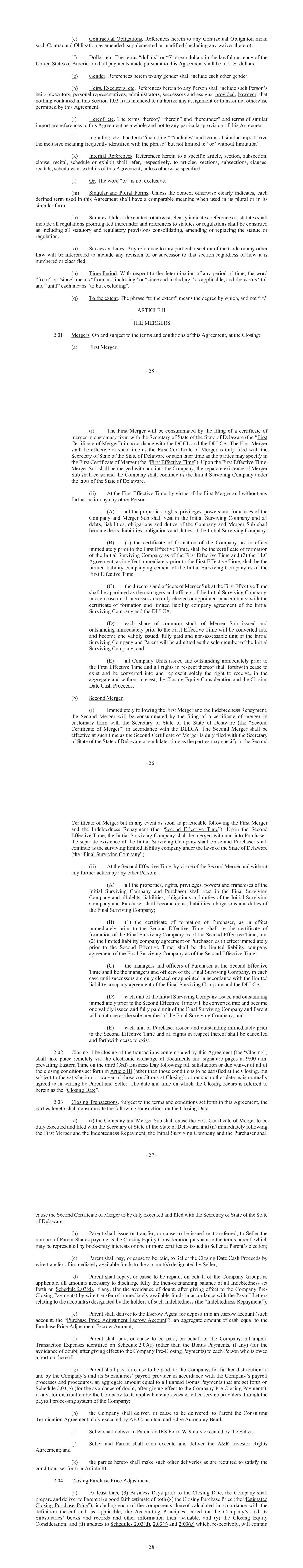 - 25 - (e) Contractual Obligations. References herein to any Contractual Obligation mean such Contractual Obligation as amended, supplemented or modified (including any waiver thereto). (f) Dollar, etc. The terms “dollars” or “$” mean dollars in the lawful currency of the United States of America and all payments made pursuant to this Agreement shall be in U.S. dollars. (g) Gender. References herein to any gender shall include each other gender. (h) Heirs, Executors, etc. References herein to any Person shall include such Person’s heirs, executors, personal representatives, administrators, successors and assigns; provided, however, that nothing contained in this Section 1.02(h) is intended to authorize any assignment or transfer not otherwise permitted by this Agreement. (i) Hereof, etc. The terms “hereof,” “herein” and “hereunder” and terms of similar import are references to this Agreement as a whole and not to any particular provision of this Agreement. (j) Including, etc. The term “including,” “includes” and terms of similar import have the inclusive meaning frequently identified with the phrase “but not limited to” or “without limitation”. (k) Internal References. References herein to a specific article, section, subsection, clause, recital, schedule or exhibit shall refer, respectively, to articles, sections, subsections, clauses, recitals, schedules or exhibits of this Agreement, unless otherwise specified. (l) Or. The word “or” is not exclusive. (m) Singular and Plural Forms. Unless the context otherwise clearly indicates, each defined term used in this Agreement shall have a comparable meaning when used in its plural or in its singular form. (n) Statutes. Unless the context otherwise clearly indicates, references to statutes shall include all regulations promulgated thereunder and references to statutes or regulations shall be construed as including all statutory and regulatory provisions consolidating, amending or replacing the statute or regulation. (o) Successor Laws. Any reference to any particular section of the Code or any other Law will be interpreted to include any revision of or successor to that section regardless of how it is numbered or classified. (p) Time Period. With respect to the determination of any period of time, the word “from” or “since” means “from and including” or “since and including,” as applicable, and the words “to” and “until” each means “to but excluding”. (q) To the extent. The phrase “to the extent” means the degree by which, and not “if.” ARTICLE II THE MERGERS 2.01 Mergers. On and subject to the terms and conditions of this Agreement, at the Closing: (a) First Merger. - 26 - (i) The First Merger will be consummated by the filing of a certificate of merger in customary form with the Secretary of State of the State of Delaware (the “First Certificate of Merger”) in accordance with the DGCL and the DLLCA. The First Merger shall be effective at such time as the First Certificate of Merger is duly filed with the Secretary of State of the State of Delaware or such later time as the parties may specify in the First Certificate of Merger (the “First Effective Time”). Upon the First Effective Time, Merger Sub shall be merged with and into the Company, the separate existence of Merger Sub shall cease and the Company shall continue as the Initial Surviving Company under the laws of the State of Delaware. (ii) At the First Effective Time, by virtue of the First Merger and without any further action by any other Person: (A) all the properties, rights, privileges, powers and franchises of the Company and Merger Sub shall vest in the Initial Surviving Company and all debts, liabilities, obligations and duties of the Company and Merger Sub shall become debts, liabilities, obligations and duties of the Initial Surviving Company; (B) (1) the certificate of formation of the Company, as in effect immediately prior to the First Effective Time, shall be the certificate of formation of the Initial Surviving Company as of the First Effective Time and (2) the LLC Agreement, as in effect immediately prior to the First Effective Time, shall be the limited liability company agreement of the Initial Surviving Company as of the First Effective Time; (C) the directors and officers of Merger Sub at the First Effective Time shall be appointed as the managers and officers of the Initial Surviving Company, in each case until successors are duly elected or appointed in accordance with the certificate of formation and limited liability company agreement of the Initial Surviving Company and the DLLCA; (D) each share of common stock of Merger Sub issued and outstanding immediately prior to the First Effective Time will be converted into and become one validly issued, fully paid and non-assessable unit of the Initial Surviving Company and Parent will be admitted as the sole member of the Initial Surviving Company; and (E) all Company Units issued and outstanding immediately prior to the First Effective Time and all rights in respect thereof shall forthwith cease to exist and be converted into and represent solely the right to receive, in the aggregate and without interest, the Closing Equity Consideration and the Closing Date Cash Proceeds. (b) Second Merger. (i) Immediately following the First Merger and the Indebtedness Repayment, the Second Merger will be consummated by the filing of a certificate of merger in customary form with the Secretary of State of the State of Delaware (the “Second Certificate of Merger”) in accordance with the DLLCA. The Second Merger shall be effective at such time as the Second Certificate of Merger is duly filed with the Secretary of State of the State of Delaware or such later time as the parties may specify in the Second - 27 - Certificate of Merger but in any event as soon as practicable following the First Merger and the Indebtedness Repayment (the “Second E
