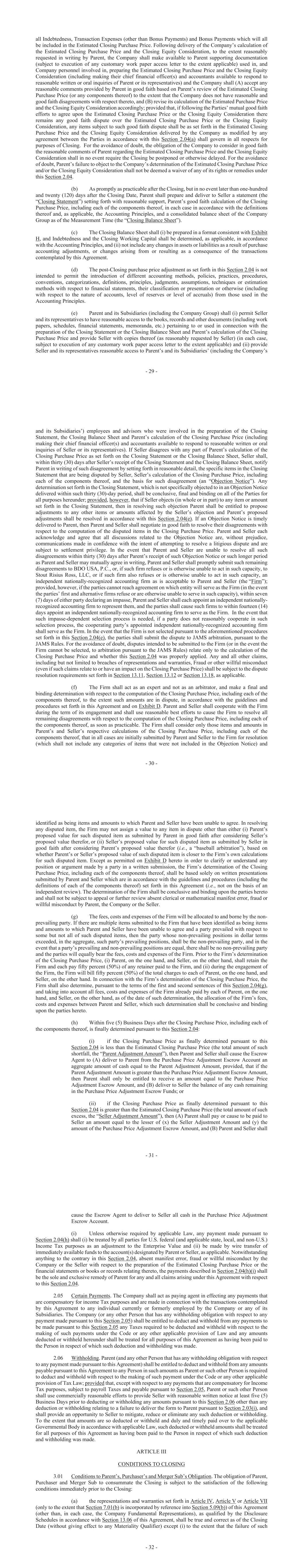 - 29 - all Indebtedness, Transaction Expenses (other than Bonus Payments) and Bonus Payments which will all be included in the Estimated Closing Purchase Price. Following delivery of the Company’s calculation of the Estimated Closing Purchase Price and the Closing Equity Consideration, to the extent reasonably requested in writing by Parent, the Company shall make available to Parent supporting documentation (subject to execution of any customary work paper access letter to the extent applicable) used in, and Company personnel involved in, preparing the Estimated Closing Purchase Price and the Closing Equity Consideration (including making their chief financial officer(s) and accountants available to respond to reasonable written or oral inquiries of Parent or its representatives) and the Company shall (A) accept any reasonable comments provided by Parent in good faith based on Parent’s review of the Estimated Closing Purchase Price (or any components thereof) to the extent that the Company does not have reasonable and good faith disagreements with respect thereto, and (B) revise its calculation of the Estimated Purchase Price and the Closing Equity Consideration accordingly; provided that, if following the Parties’ mutual good faith efforts to agree upon the Estimated Closing Purchase Price or the Closing Equity Consideration there remains any good faith dispute over the Estimated Closing Purchase Price or the Closing Equity Consideration, any items subject to such good faith dispute shall be as set forth in the Estimated Closing Purchase Price and the Closing Equity Consideration delivered by the Company as modified by any agreement between the Parties in accordance with this Section 2.04(a) shall govern in all respects for purposes of Closing. For the avoidance of doubt, the obligation of the Company to consider in good faith the reasonable comments of Parent regarding the Estimated Closing Purchase Price and the Closing Equity Consideration shall in no event require the Closing be postponed or otherwise delayed. For the avoidance of doubt, Parent’s failure to object to the Company’s determination of the Estimated Closing Purchase Price and/or the Closing Equity Consideration shall not be deemed a waiver of any of its rights or remedies under this Section 2.04. (b) As promptly as practicable after the Closing, but in no event later than one-hundred and twenty (120) days after the Closing Date, Parent shall prepare and deliver to Seller a statement (the “Closing Statement”) setting forth with reasonable support, Parent’s good faith calculation of the Closing Purchase Price, including each of the components thereof, in each case in accordance with the definitions thereof and, as applicable, the Accounting Principles, and a consolidated balance sheet of the Company Group as of the Measurement Time (the “Closing Balance Sheet”). (c) The Closing Balance Sheet shall (i) be prepared in a format consistent with Exhibit H, and Indebtedness and the Closing Working Capital shall be determined, as applicable, in accordance with the Accounting Principles, and (ii) not include any changes in assets or liabilities as a result of purchase accounting adjustments, or changes arising from or resulting as a consequence of the transactions contemplated by this Agreement. (d) The post-Closing purchase price adjustment as set forth in this Section 2.04 is not intended to permit the introduction of different accounting methods, policies, practices, procedures, conventions, categorizations, definitions, principles, judgments, assumptions, techniques or estimation methods with respect to financial statements, their classification or presentation or otherwise (including with respect to the nature of accounts, level of reserves or level of accruals) from those used in the Accounting Principles. (e) Parent and its Subsidiaries (including the Company Group) shall (i) permit Seller and its representatives to have reasonable access to the books, records and other documents (including work papers, schedules, financial statements, memoranda, etc.) pertaining to or used in connection with the preparation of the Closing Statement or the Closing Balance Sheet and Parent’s calculation of the Closing Purchase Price and provide Seller with copies thereof (as reasonably requested by Seller) (in each case, subject to execution of any customary work paper access letter to the extent applicable) and (ii) provide Seller and its representatives reasonable access to Parent’s and its Subsidiaries’ (including the Company’s - 30 - and its Subsidiaries’) employees and advisors who were involved in the preparation of the Closing Statement, the Closing Balance Sheet and Parent’s calculation of the Closing Purchase Price (including making their chief financial officer(s) and accountants available to respond to reasonable written or oral inquiries of Seller or its representatives). If Seller disagrees with any part of Parent’s calculation of the Closing Purchase Price as set forth on the Closing Statement or the Closing Balance Sheet, Seller shall, within thirty (30) days after Seller’s receipt of the Closing Statement and the Closing Balance Sheet, notify Parent in writing of such disagreement by setting forth in reasonable detail, the specific items in the Closing Statement that are being disputed by Seller, Seller’s calculation of the Closing Purchase Price, including each of the components thereof, and the basis for such disagreement (an “Objection Notice”). Any determination set forth in the Closing Statement, which is not specifically objected to in an Objection Notice delivered within such thirty (30)-day period, shall be conclusive, final and binding on all of the Parties for all purposes hereunder; provided, however, that if Seller objects (in whole or in part) to any item or amount set forth in the Closing Statement, then in resolving such objection Parent shall be entitled to propose ad
