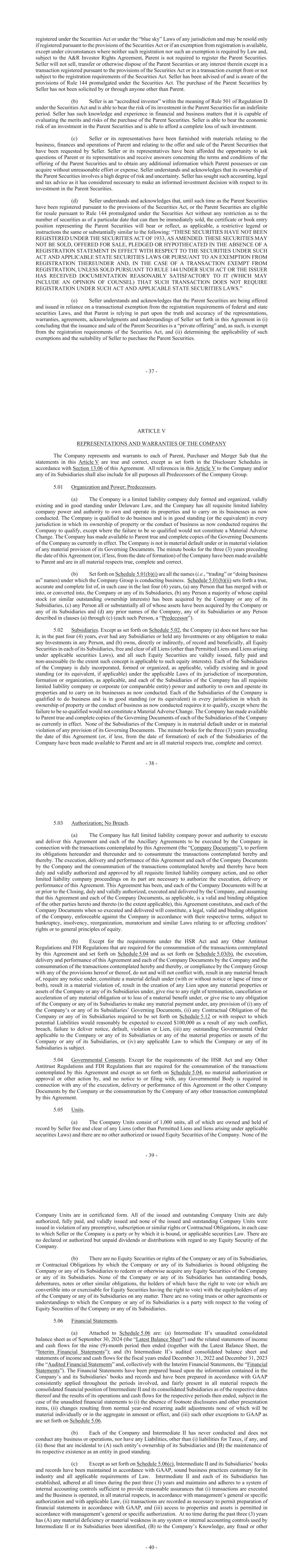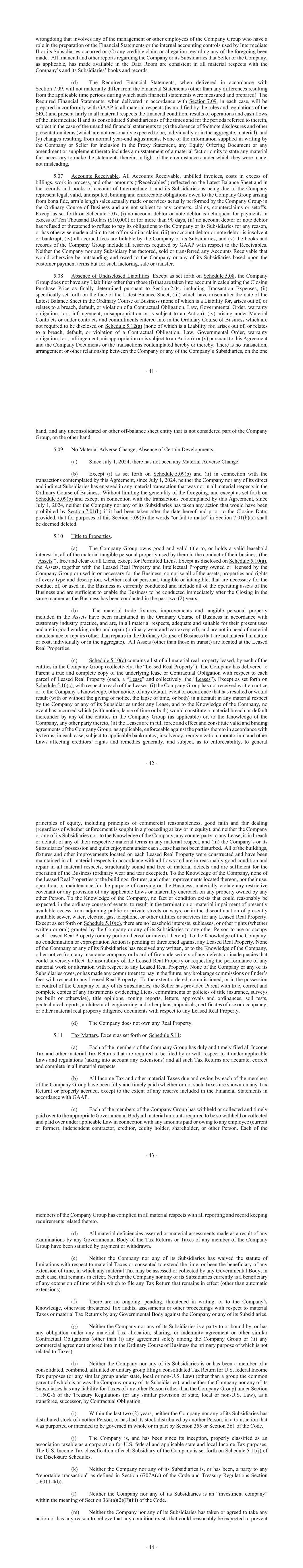 - 41 - wrongdoing that involves any of the management or other employees of the Company Group who have a role in the preparation of the Financial Statements or the internal accounting controls used by Intermediate II or its Subsidiaries occurred or (C) any credible claim or allegation regarding any of the foregoing been made. All financial and other reports regarding the Company or its Subsidiaries that Seller or the Company, as applicable, has made available in the Data Room are consistent in all material respects with the Company’s and its Subsidiaries’ books and records. (d) The Required Financial Statements, when delivered in accordance with Section 7.09, will not materially differ from the Financial Statements (other than any differences resulting from the applicable time periods during which such financial statements were measured and prepared). The Required Financial Statements, when delivered in accordance with Section 7.09, in each case, will be prepared in conformity with GAAP in all material respects (as modified by the rules and regulations of the SEC) and present fairly in all material respects the financial condition, results of operations and cash flows of the Intermediate II and its consolidated Subsidiaries as of the times and for the periods referred to therein, subject in the case of the unaudited financial statements to (x) the absence of footnote disclosures and other presentation items (which are not reasonably expected to be, individually or in the aggregate, material), and (y) changes resulting from normal year-end adjustments. None of the information supplied in writing by the Company or Seller for inclusion in the Proxy Statement, any Equity Offering Document or any amendment or supplement thereto includes a misstatement of a material fact or omits to state any material fact necessary to make the statements therein, in light of the circumstances under which they were made, not misleading. 5.07 Accounts Receivable. All Accounts Receivable, unbilled invoices, costs in excess of billings, work in process, and other amounts (“Receivables”) reflected on the Latest Balance Sheet and in the records and books of account of Intermediate II and its Subsidiaries as being due to the Company represent legal, valid, undisputed, binding and enforceable obligations owed to the Company Group arising from bona fide, arm’s length sales actually made or services actually performed by the Company Group in the Ordinary Course of Business and are not subject to any contests, claims, counterclaims or setoffs. Except as set forth on Schedule 5.07, (i) no account debtor or note debtor is delinquent for payments in excess of Ten Thousand Dollars ($10,000) or for more than 90 days, (ii) no account debtor or note debtor has refused or threatened to refuse to pay its obligations to the Company or its Subsidiaries for any reason, or has otherwise made a claim to set-off or similar claim, (iii) no account debtor or note debtor is insolvent or bankrupt, (iv) all accrued fees are billable by the Company or its Subsidiaries, and (v) the books and records of the Company Group include all reserves required by GAAP with respect to the Receivables. Neither the Company nor any Subsidiary has factored, sold or transferred any Accounts Receivable that would otherwise be outstanding and owed to the Company or any of its Subsidiaries based upon the customer payment terms but for such factoring, sale or transfer. 5.08 Absence of Undisclosed Liabilities. Except as set forth on Schedule 5.08, the Company Group does not have any Liabilities other than those (i) that are taken into account in calculating the Closing Purchase Price as finally determined pursuant to Section 2.04, including Transaction Expenses, (ii) specifically set forth on the face of the Latest Balance Sheet, (iii) which have arisen after the date of the Latest Balance Sheet in the Ordinary Course of Business (none of which is a Liability for, arises out of, or relates to a breach, default, or violation of a Contractual Obligation, Law, Governmental Order, warranty obligation, tort, infringement, misappropriation or is subject to an Action), (iv) arising under Material Contracts or under contracts and commitments entered into in the Ordinary Course of Business which are not required to be disclosed on Schedule 5.12(a) (none of which is a Liability for, arises out of, or relates to a breach, default, or violation of a Contractual Obligation, Law, Governmental Order, warranty obligation, tort, infringement, misappropriation or is subject to an Action), or (v) pursuant to this Agreement and the Company Documents or the transactions contemplated hereby or thereby. There is no transaction, arrangement or other relationship between the Company or any of the Company’s Subsidiaries, on the one - 42 - hand, and any unconsolidated or other off-balance sheet entity that is not considered part of the Company Group, on the other hand. 5.09 No Material Adverse Change; Absence of Certain Developments. (a) Since July 1, 2024, there has not been any Material Adverse Change. (b) Except (i) as set forth on Schedule 5.09(b) and (ii) in connection with the transactions contemplated by this Agreement, since July 1, 2024, neither the Company nor any of its direct and indirect Subsidiaries has engaged in any material transaction that was not in all material respects in the Ordinary Course of Business. Without limiting the generality of the foregoing, and except as set forth on Schedule 5.09(b) and except in connection with the transactions contemplated by this Agreement, since July 1, 2024, neither the Company nor any of its Subsidiaries has taken any action that would have been prohibited by Section 7.01(b) if it had been taken after the date hereof and prior to the Closing Date; provided, that for purposes of this Section 5.09(b) the words “or fail to make” in Section 7.01(b)(x) shall be deemed deleted. 5.10 Title to Properties. (a) The Company Gro