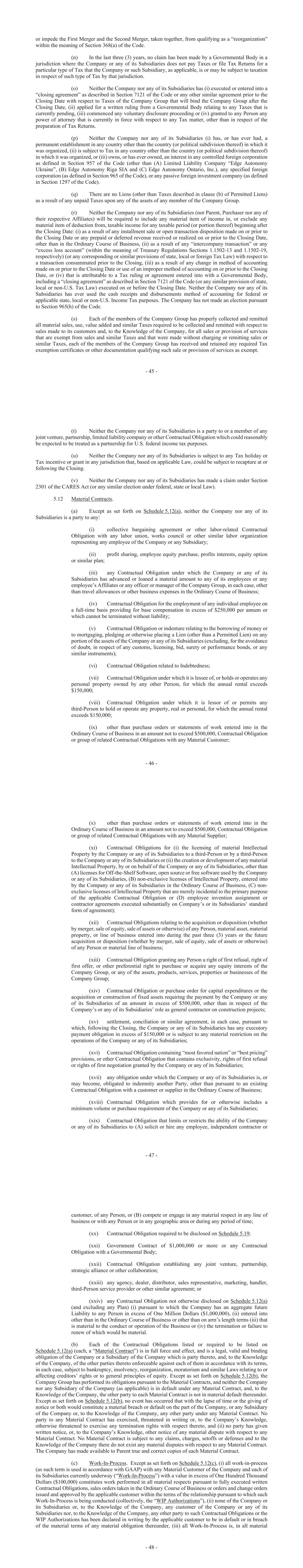 - 45 - or impede the First Merger and the Second Merger, taken together, from qualifying as a “reorganization” within the meaning of Section 368(a) of the Code. (n) In the last three (3) years, no claim has been made by a Governmental Body in a jurisdiction where the Company or any of its Subsidiaries does not pay Taxes or file Tax Returns for a particular type of Tax that the Company or such Subsidiary, as applicable, is or may be subject to taxation in respect of such type of Tax by that jurisdiction. (o) Neither the Company nor any of its Subsidiaries has (i) executed or entered into a “closing agreement” as described in Section 7121 of the Code or any other similar agreement prior to the Closing Date with respect to Taxes of the Company Group that will bind the Company Group after the Closing Date, (ii) applied for a written ruling from a Governmental Body relating to any Taxes that is currently pending, (iii) commenced any voluntary disclosure proceeding or (iv) granted to any Person any power of attorney that is currently in force with respect to any Tax matter, other than in respect of the preparation of Tax Returns. (p) Neither the Company nor any of its Subsidiaries (i) has, or has ever had, a permanent establishment in any country other than the country (or political subdivision thereof) in which it was organized, (ii) is subject to Tax in any country other than the country (or political subdivision thereof) in which it was organized, or (iii) owns, or has ever owned, an interest in any controlled foreign corporation as defined in Section 957 of the Code (other than (A) Limited Liability Company “Edge Autonomy Ukraine”, (B) Edge Autonomy Riga SIA and (C) Edge Autonomy Ontario, Inc.), any specified foreign corporation (as defined in Section 965 of the Code), or any passive foreign investment company (as defined in Section 1297 of the Code). (q) There are no Liens (other than Taxes described in clause (b) of Permitted Liens) as a result of any unpaid Taxes upon any of the assets of any member of the Company Group. (r) Neither the Company nor any of its Subsidiaries (nor Parent, Purchaser nor any of their respective Affiliates) will be required to include any material item of income in, or exclude any material item of deduction from, taxable income for any taxable period (or portion thereof) beginning after the Closing Date: (i) as a result of any installment sale or open transaction disposition made on or prior to the Closing Date or any prepaid or deferred revenue received or realized on or prior to the Closing Date, other than in the Ordinary Course of Business, (ii) as a result of any “intercompany transaction” or any “excess loss account” (within the meaning of Treasury Regulations Sections 1.1502-13 and 1.1502-19, respectively) (or any corresponding or similar provisions of state, local or foreign Tax Law) with respect to a transaction consummated prior to the Closing, (iii) as a result of any change in method of accounting made on or prior to the Closing Date or use of an improper method of accounting on or prior to the Closing Date, or (iv) that is attributable to a Tax ruling or agreement entered into with a Governmental Body, including a “closing agreement” as described in Section 7121 of the Code (or any similar provision of state, local or non-U.S. Tax Law) executed on or before the Closing Date. Neither the Company nor any of its Subsidiaries has ever used the cash receipts and disbursements method of accounting for federal or applicable state, local or non-U.S. Income Tax purposes. The Company has not made an election pursuant to Section 965(h) of the Code. (s) Each of the members of the Company Group has properly collected and remitted all material sales, use, value added and similar Taxes required to be collected and remitted with respect to sales made to its customers and, to the Knowledge of the Company, for all sales or provision of services that are exempt from sales and similar Taxes and that were made without charging or remitting sales or similar Taxes, each of the members of the Company Group has received and retained any required Tax exemption certificates or other documentation qualifying such sale or provision of services as exempt. - 46 - (t) Neither the Company nor any of its Subsidiaries is a party to or a member of any joint venture, partnership, limited liability company or other Contractual Obligation which could reasonably be expected to be treated as a partnership for U.S. federal income tax purposes. (u) Neither the Company nor any of its Subsidiaries is subject to any Tax holiday or Tax incentive or grant in any jurisdiction that, based on applicable Law, could be subject to recapture at or following the Closing. (v) Neither the Company nor any of its Subsidiaries has made a claim under Section 2301 of the CARES Act (or any similar election under federal, state or local Law). 5.12 Material Contracts. (a) Except as set forth on Schedule 5.12(a), neither the Company nor any of its Subsidiaries is a party to any: (i) collective bargaining agreement or other labor-related Contractual Obligation with any labor union, works council or other similar labor organization representing any employee of the Company or any Subsidiary; (ii) profit sharing, employee equity purchase, profits interests, equity option or similar plan; (iii) any Contractual Obligation under which the Company or any of its Subsidiaries has advanced or loaned a material amount to any of its employees or any employee’s Affiliates or any officer or manager of the Company Group, in each case, other than travel allowances or other business expenses in the Ordinary Course of Business; (iv) Contractual Obligation for the employment of any individual employee on a full-time basis providing for base compensation in excess of $250,000 per annum or which cannot be terminated without liability; (v) Contractual Obligation or indenture relating to the borrowing of money 