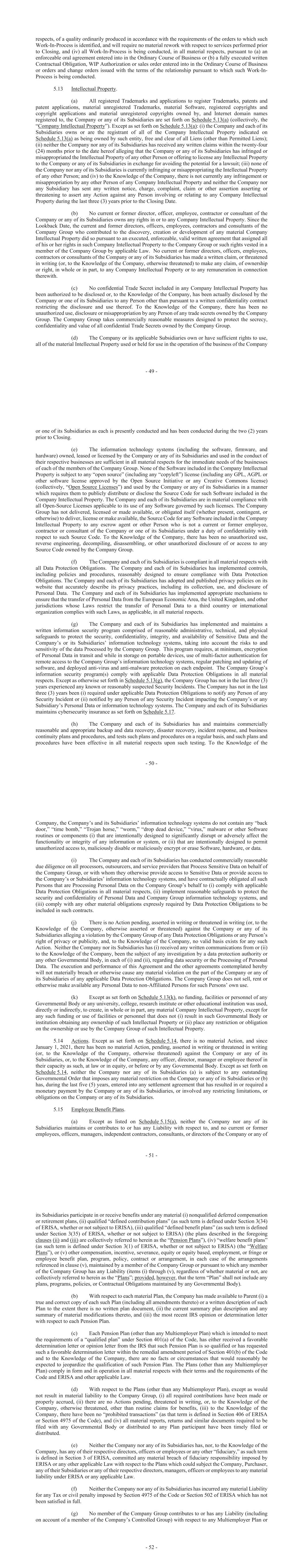 - 49 - respects, of a quality ordinarily produced in accordance with the requirements of the orders to which such Work-In-Process is identified, and will require no material rework with respect to services performed prior to Closing, and (iv) all Work-In-Process is being conducted, in all material respects, pursuant to (a) an enforceable oral agreement entered into in the Ordinary Course of Business or (b) a fully executed written Contractual Obligation, WIP Authorization or sales order entered into in the Ordinary Course of Business or orders and change orders issued with the terms of the relationship pursuant to which such Work-In- Process is being conducted. 5.13 Intellectual Property. (a) All registered Trademarks and applications to register Trademarks, patents and patent applications, material unregistered Trademarks, material Software, registered copyrights and copyright applications and material unregistered copyrights owned by, and Internet domain names registered to, the Company or any of its Subsidiaries are set forth on Schedule 5.13(a) (collectively, the “Company Intellectual Property”). Except as set forth on Schedule 5.13(a): (i) the Company and each of its Subsidiaries owns or are the registrant of all of the Company Intellectual Property indicated on Schedule 5.13(a) as being owned by such entity, free and clear of all Liens (other than Permitted Liens); (ii) neither the Company nor any of its Subsidiaries has received any written claims within the twenty-four (24) months prior to the date hereof alleging that the Company or any of its Subsidiaries has infringed or misappropriated the Intellectual Property of any other Person or offering to license any Intellectual Property to the Company or any of its Subsidiaries in exchange for avoiding the potential for a lawsuit; (iii) none of the Company nor any of its Subsidiaries is currently infringing or misappropriating the Intellectual Property of any other Person; and (iv) to the Knowledge of the Company, there is not currently any infringement or misappropriation by any other Person of any Company Intellectual Property and neither the Company nor any Subsidiary has sent any written notice, charge, complaint, claim or other assertion asserting or threatening to assert any Action against any Person involving or relating to any Company Intellectual Property during the last three (3) years prior to the Closing Date. (b) No current or former director, officer, employee, contractor or consultant of the Company or any of its Subsidiaries owns any rights in or to any Company Intellectual Property. Since the Lookback Date, the current and former directors, officers, employees, contractors and consultants of the Company Group who contributed to the discovery, creation or development of any material Company Intellectual Property did so pursuant to an executed, enforceable, valid written agreement that assigned all of his or her rights in such Company Intellectual Property to the Company Group or such rights vested in a member of the Company Group by applicable Law. No current or former directors, officers, employees, contractors or consultants of the Company or any of its Subsidiaries has made a written claim, or threatened in writing (or, to the Knowledge of the Company, otherwise threatened) to make any claim, of ownership or right, in whole or in part, to any Company Intellectual Property or to any remuneration in connection therewith. (c) No confidential Trade Secret included in any Company Intellectual Property has been authorized to be disclosed or, to the Knowledge of the Company, has been actually disclosed by the Company or one of its Subsidiaries to any Person other than pursuant to a written confidentiality contract restricting the disclosure and use thereof. To the Knowledge of the Company, there has been no unauthorized use, disclosure or misappropriation by any Person of any trade secrets owned by the Company Group. The Company Group takes commercially reasonable measures designed to protect the secrecy, confidentiality and value of all confidential Trade Secrets owned by the Company Group. (d) The Company or its applicable Subsidiaries own or have sufficient rights to use, all of the material Intellectual Property used or held for use in the operation of the business of the Company - 50 - or one of its Subsidiaries as each is presently conducted and has been conducted during the two (2) years prior to Closing. (e) The information technology systems (including the software, firmware, and hardware) owned, leased or licensed by the Company or any of its Subsidiaries and used in the conduct of their respective businesses are sufficient in all material respects for the immediate needs of the businesses of each of the members of the Company Group. None of the Software included in the Company Intellectual Property is subject to any “open source” (including any “copyleft”) license (including any GPL, AGPL or other software license approved by the Open Source Initiative or any Creative Commons license) (collectively, “Open Source Licenses”) and used by the Company or any of its Subsidiaries in a manner which requires them to publicly distribute or disclose the Source Code for such Software included in the Company Intellectual Property. The Company and each of its Subsidiaries are in material compliance with all Open-Source Licenses applicable to its use of any Software governed by such licenses. The Company Group has not delivered, licensed or made available, or obligated itself (whether present, contingent, or otherwise) to deliver, license or make available, the Source Code for any Software included in the Company Intellectual Property to any escrow agent or other Person who is not a current or former employee, contractor or consultant of the Company or one of its Subsidiaries under a duty of confidentiality with respect to such Source Code. To the Knowledge of the Company, there has been no unauthorized use, r