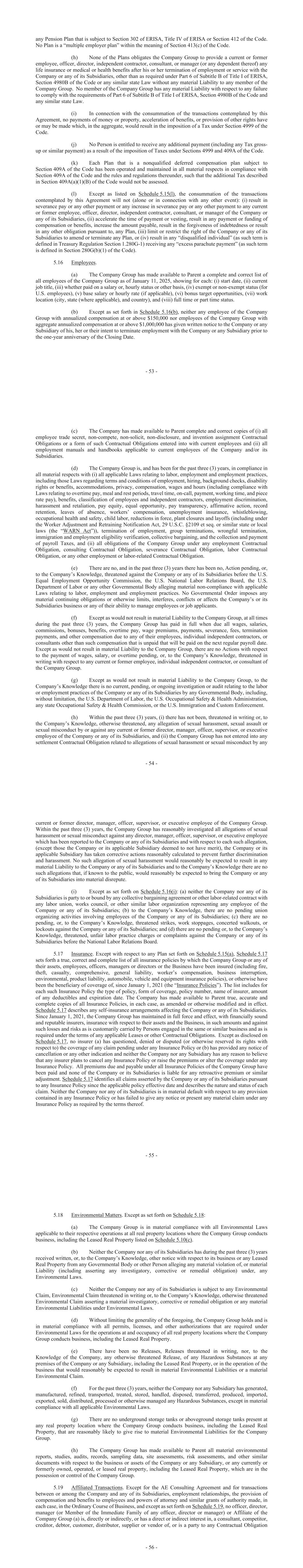 - 53 - any Pension Plan that is subject to Section 302 of ERISA, Title IV of ERISA or Section 412 of the Code. No Plan is a “multiple employer plan” within the meaning of Section 413(c) of the Code. (h) None of the Plans obligates the Company Group to provide a current or former employee, officer, director, independent contractor, consultant, or manager (or any dependent thereof) any life insurance or medical or health benefits after his or her termination of employment or service with the Company or any of its Subsidiaries, other than as required under Part 6 of Subtitle B of Title I of ERISA, Section 4980B of the Code or any similar state Law without any material Liability to any member of the Company Group. No member of the Company Group has any material Liability with respect to any failure to comply with the requirements of Part 6 of Subtitle B of Title I of ERISA, Section 4980B of the Code and any similar state Law. (i) In connection with the consummation of the transactions contemplated by this Agreement, no payments of money or property, acceleration of benefits, or provision of other rights have or may be made which, in the aggregate, would result in the imposition of a Tax under Section 4999 of the Code. (j) No Person is entitled to receive any additional payment (including any Tax gross- up or similar payment) as a result of the imposition of Taxes under Sections 4999 and 409A of the Code. (k) Each Plan that is a nonqualified deferred compensation plan subject to Section 409A of the Code has been operated and maintained in all material respects in compliance with Section 409A of the Code and the rules and regulations thereunder, such that the additional Tax described in Section 409A(a)(1)(B) of the Code would not be assessed. (l) Except as listed on Schedule 5.15(l), the consummation of the transactions contemplated by this Agreement will not (alone or in connection with any other event): (i) result in severance pay or any other payment or any increase in severance pay or any other payment to any current or former employee, officer, director, independent contractor, consultant, or manager of the Company or any of its Subsidiaries, (ii) accelerate the time of payment or vesting, result in any payment or funding of compensation or benefits, increase the amount payable, result in the forgiveness of indebtedness or result in any other obligation pursuant to, any Plan, (iii) limit or restrict the right of the Company or any of its Subsidiaries to amend or terminate any Plan, or (iv) result in any “disqualified individual” (as such term is defined in Treasury Regulation Section 1.280G-1) receiving any “excess parachute payment” (as such term is defined in Section 280G(b)(1) of the Code). 5.16 Employees. (a) The Company Group has made available to Parent a complete and correct list of all employees of the Company Group as of January 11, 2025, showing for each: (i) start date, (ii) current job title, (iii) whether paid on a salary or, hourly status or other basis, (iv) exempt or non-exempt status (for U.S. employees), (v) base salary or hourly rate (if applicable), (vi) bonus target opportunities, (vii) work location (city, state (where applicable), and country), and (viii) full time or part time status. (b) Except as set forth in Schedule 5.16(b), neither any employee of the Company Group with annualized compensation at or above $150,000 nor employees of the Company Group with aggregate annualized compensation at or above $1,000,000 has given written notice to the Company or any Subsidiary of his, her or their intent to terminate employment with the Company or any Subsidiary prior to the one-year anniversary of the Closing Date. - 54 - (c) The Company has made available to Parent complete and correct copies of (i) all employee trade secret, non-compete, non-solicit, non-disclosure, and invention assignment Contractual Obligations or a form of such Contractual Obligations entered into with current employees and (ii) all employment manuals and handbooks applicable to current employees of the Company and/or its Subsidiaries. (d) The Company Group is, and has been for the past three (3) years, in compliance in all material respects with (i) all applicable Laws relating to labor, employment and employment practices, including those Laws regarding terms and conditions of employment, hiring, background checks, disability rights or benefits, accommodations, privacy, compensation, wages and hours (including compliance with Laws relating to overtime pay, meal and rest periods, travel time, on-call, payment, working time, and piece rate pay), benefits, classification of employees and independent contractors, employment discrimination, harassment and retaliation, pay equity, equal opportunity, pay transparency, affirmative action, record retention, leaves of absence, workers’ compensation, unemployment insurance, whistleblowing, occupational health and safety, child labor, reductions in force, plant closures and layoffs (including under the Worker Adjustment and Retraining Notification Act, 29 U.S.C. §2109 et seq. or similar state or local laws (the “WARN Act”)), termination of employment, group terminations, wrongful termination, immigration and employment eligibility verification, collective bargaining, and the collection and payment of payroll Taxes, and (ii) all obligations of the Company Group under any employment Contractual Obligation, consulting Contractual Obligation, severance Contractual Obligation, labor Contractual Obligation, or any other employment or labor-related Contractual Obligation. (e) There are no, and in the past three (3) years there has been no, Action pending, or, to the Company’s Knowledge, threatened against the Company or any of its Subsidiaries before the U.S. Equal Employment Opportunity Commission, the U.S. National Labor Relations Board, the U.S. Department of Labor or any other Governmental Body alleging material non-compliance with applica