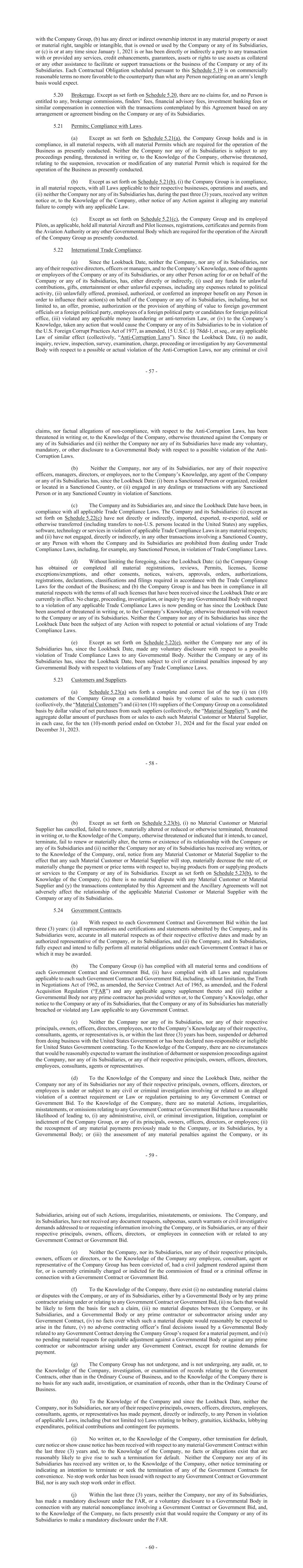 - 57 - with the Company Group, (b) has any direct or indirect ownership interest in any material property or asset or material right, tangible or intangible, that is owned or used by the Company or any of its Subsidiaries, or (c) is or at any time since January 1, 2021 is or has been directly or indirectly a party to any transaction with or provided any services, credit enhancements, guarantees, assets or rights to use assets as collateral or any other assistance to facilitate or support transactions or the business of the Company or any of its Subsidiaries. Each Contractual Obligation scheduled pursuant to this Schedule 5.19 is on commercially reasonable terms no more favorable to the counterparty than what any Person negotiating on an arm’s length basis would expect. 5.20 Brokerage. Except as set forth on Schedule 5.20, there are no claims for, and no Person is entitled to any, brokerage commissions, finders’ fees, financial advisory fees, investment banking fees or similar compensation in connection with the transactions contemplated by this Agreement based on any arrangement or agreement binding on the Company or any of its Subsidiaries. 5.21 Permits; Compliance with Laws. (a) Except as set forth on Schedule 5.21(a), the Company Group holds and is in compliance, in all material respects, with all material Permits which are required for the operation of the Business as presently conducted. Neither the Company nor any of its Subsidiaries is subject to any proceedings pending, threatened in writing or, to the Knowledge of the Company, otherwise threatened, relating to the suspension, revocation or modification of any material Permit which is required for the operation of the Business as presently conducted. (b) Except as set forth on Schedule 5.21(b), (i) the Company Group is in compliance, in all material respects, with all Laws applicable to their respective businesses, operations and assets, and (ii) neither the Company nor any of its Subsidiaries has, during the past three (3) years, received any written notice or, to the Knowledge of the Company, other notice of any Action against it alleging any material failure to comply with any applicable Law. (c) Except as set forth on Schedule 5.21(c), the Company Group and its employed Pilots, as applicable, hold all material Aircraft and Pilot licenses, registrations, certificates and permits from the Aviation Authority or any other Governmental Body which are required for the operation of the Aircraft of the Company Group as presently conducted. 5.22 International Trade Compliance. (a) Since the Lookback Date, neither the Company, nor any of its Subsidiaries, nor any of their respective directors, officers or managers, and to the Company’s Knowledge, none of the agents or employees of the Company or any of its Subsidiaries, or any other Person acting for or on behalf of the Company or any of its Subsidiaries, has, either directly or indirectly, (i) used any funds for unlawful contributions, gifts, entertainment or other unlawful expenses, including any expenses related to political activity, (ii) unlawfully offered, promised, authorized, or conferred an improper benefit on any Person in order to influence their action(s) on behalf of the Company or any of its Subsidiaries, including, but not limited to, an offer, promise, authorization or the provision of anything of value to foreign government officials or a foreign political party, employees of a foreign political party or candidates for foreign political office, (iii) violated any applicable money laundering or anti-terrorism Law, or (iv) to the Company’s Knowledge, taken any action that would cause the Company or any of its Subsidiaries to be in violation of the U.S. Foreign Corrupt Practices Act of 1977, as amended, 15 U.S.C. §§ 78dd-1, et seq., or any applicable Law of similar effect (collectively, “Anti-Corruption Laws”). Since the Lookback Date, (i) no audit, inquiry, review, inspection, survey, examination, charge, proceeding or investigation by any Governmental Body with respect to a possible or actual violation of the Anti-Corruption Laws, nor any criminal or civil - 58 - claims, nor factual allegations of non-compliance, with respect to the Anti-Corruption Laws, has been threatened in writing or, to the Knowledge of the Company, otherwise threatened against the Company or any of its Subsidiaries and (ii) neither the Company nor any of its Subsidiaries have made any voluntary, mandatory, or other disclosure to a Governmental Body with respect to a possible violation of the Anti- Corruption Laws. (b) Neither the Company, nor any of its Subsidiaries, nor any of their respective officers, managers, directors, or employees, nor to the Company’s Knowledge, any agent of the Company or any of its Subsidiaries has, since the Lookback Date: (i) been a Sanctioned Person or organized, resident or located in a Sanctioned Country, or (ii) engaged in any dealings or transactions with any Sanctioned Person or in any Sanctioned Country in violation of Sanctions. (c) The Company and its Subsidiaries are, and since the Lookback Date have been, in compliance with all applicable Trade Compliance Laws. The Company and its Subsidiaries: (i) except as set forth on Schedule 5.22(c) have not directly or indirectly, imported, exported, re-exported, sold or otherwise transferred (including transfers to non-U.S. persons located in the United States) any supplies, software, technology or services in violation of applicable Trade Compliance Laws in any material respects; and (ii) have not engaged, directly or indirectly, in any other transactions involving a Sanctioned Country, or any Person with whom the Company and its Subsidiaries are prohibited from dealing under Trade Compliance Laws, including, for example, any Sanctioned Person, in violation of Trade Compliance Laws. (d) Without limiting the foregoing, since the Lookback Date: (a) the Company Group has obtained or completed all materia